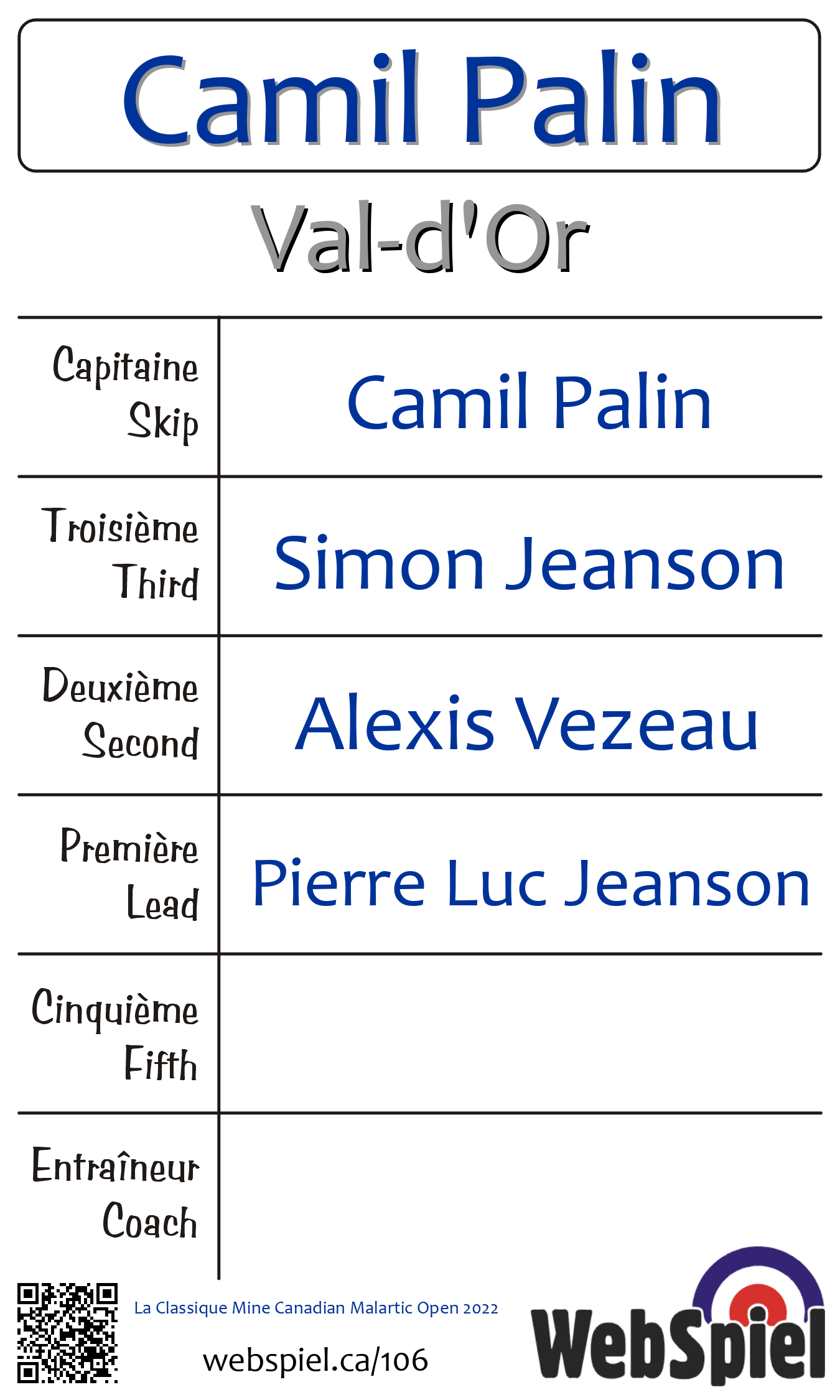 Thursday, April 7th, 2022, at 7:30pm EDT Club de curling du Belvédère, Sheet 1 · A, Winner › A17, Loser › C01 | |||||||||