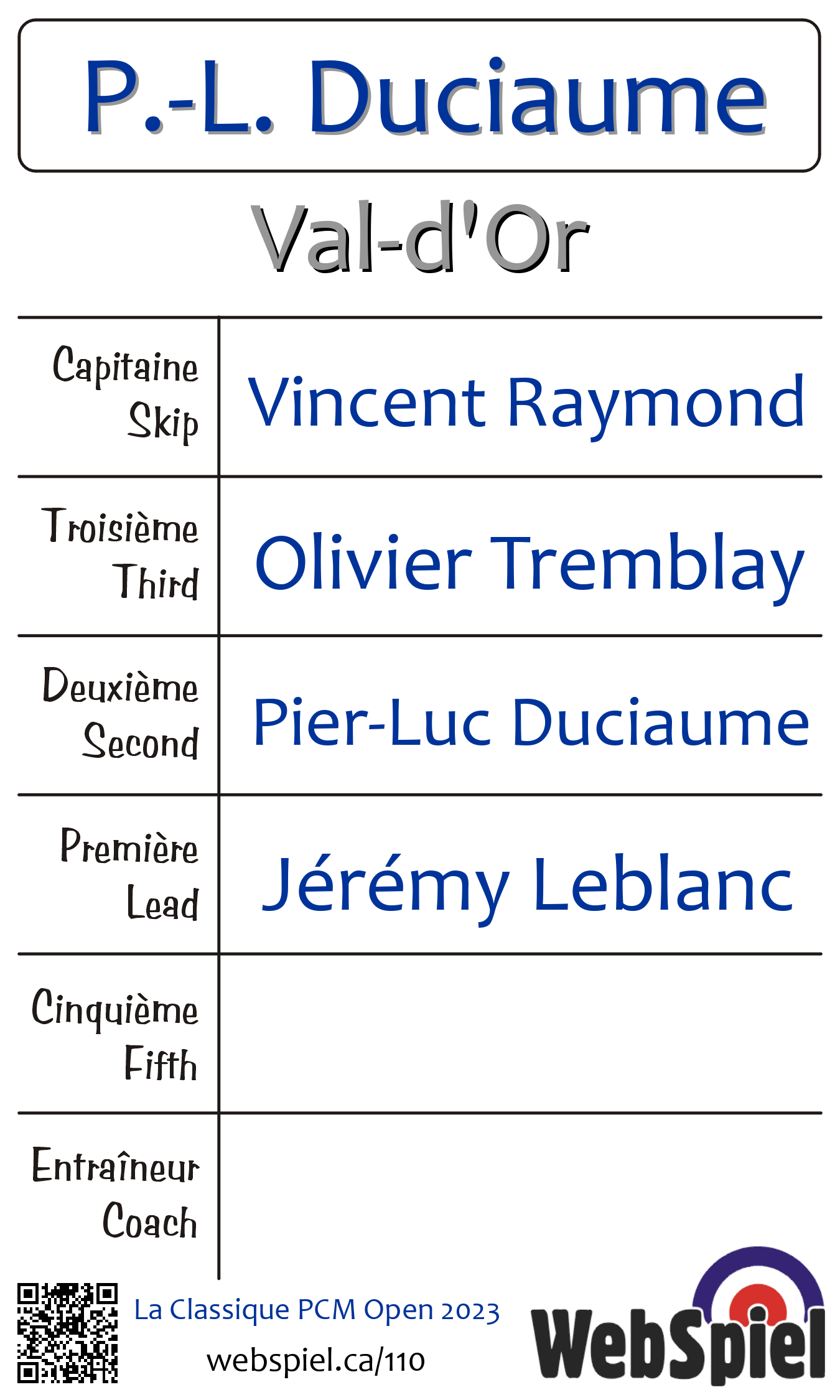 Sunday, February 19th, 2023, at 8:00am EST Club de curling du Belvédère, Sheet 4 · D, Winner › D07, Loser › OUT | ||||||||||