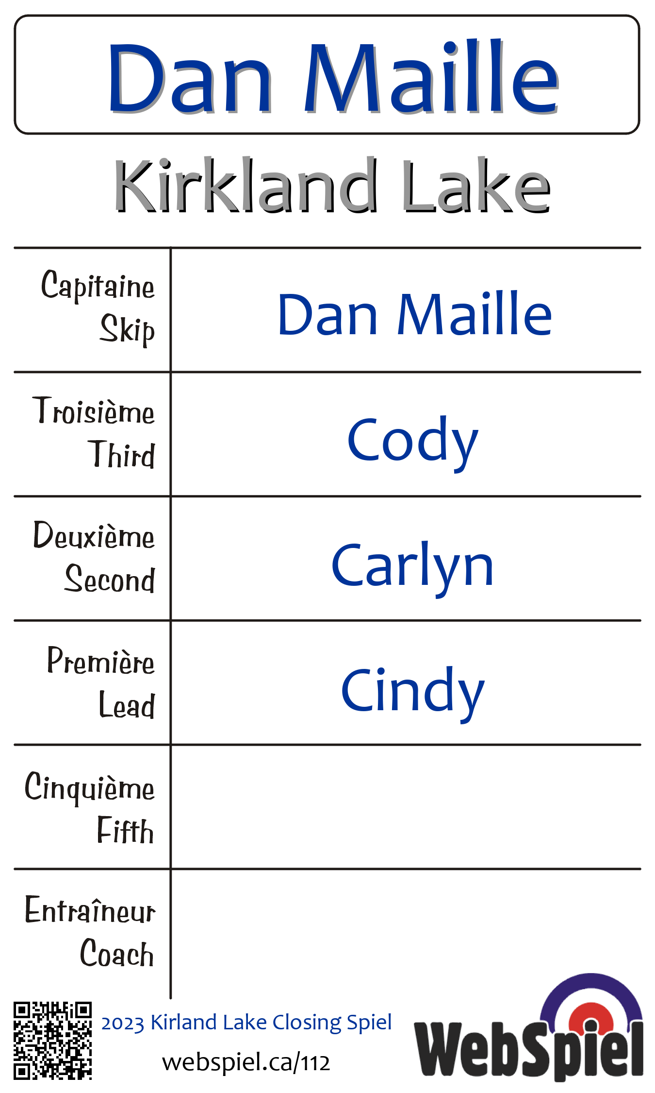 Saturday, April 15th, 2023, at 9:30am EDT Kirkland Lake Curling Club, Sheet 3, Winner › B09, Loser › D02 | |||||||||