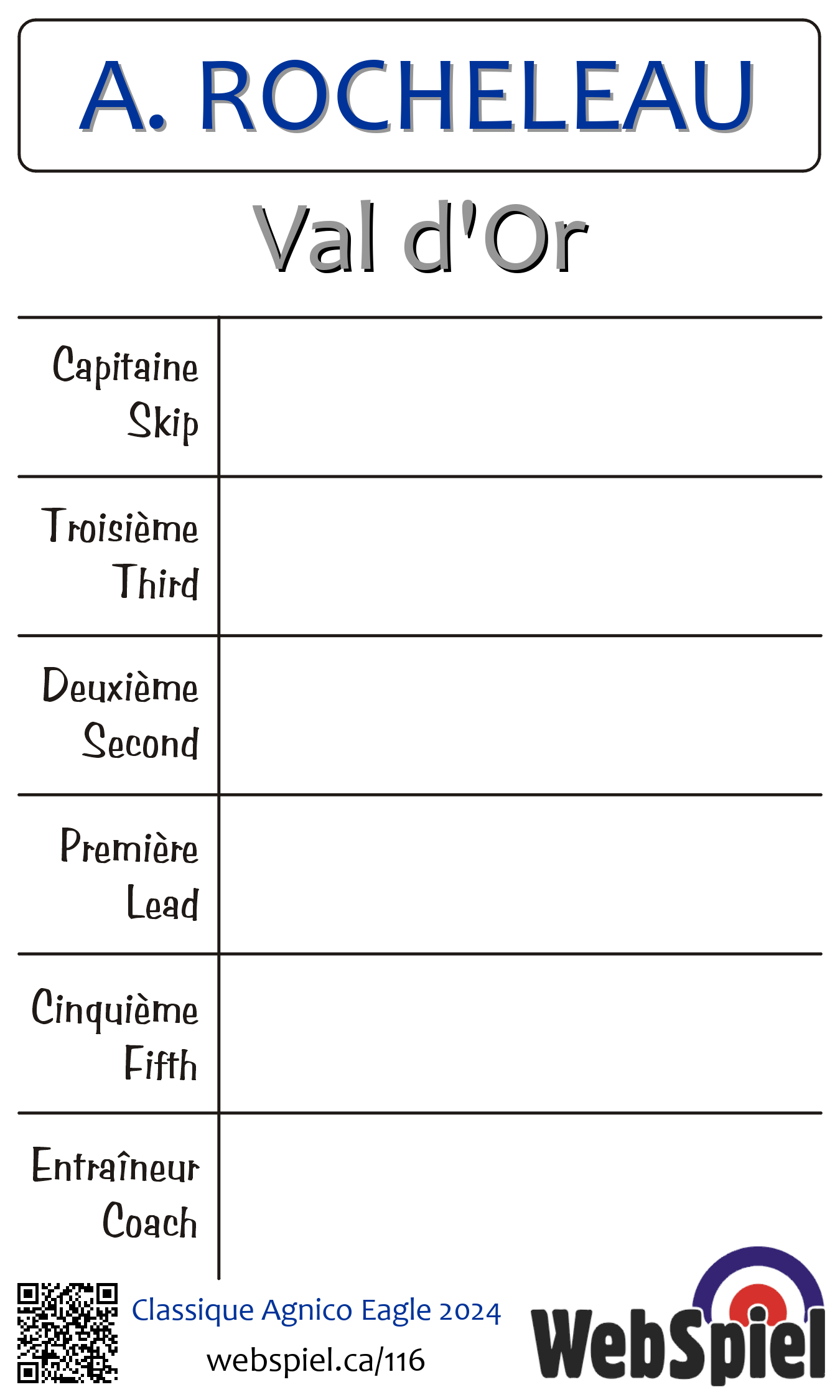| Club | Val d'Or Club de curling du Belvédère 360, boul. Sabourin Val-d'Or, QC J9P 4N9 CANADA T: 819-824-5090 F: 819-824-4454 4 sheets |