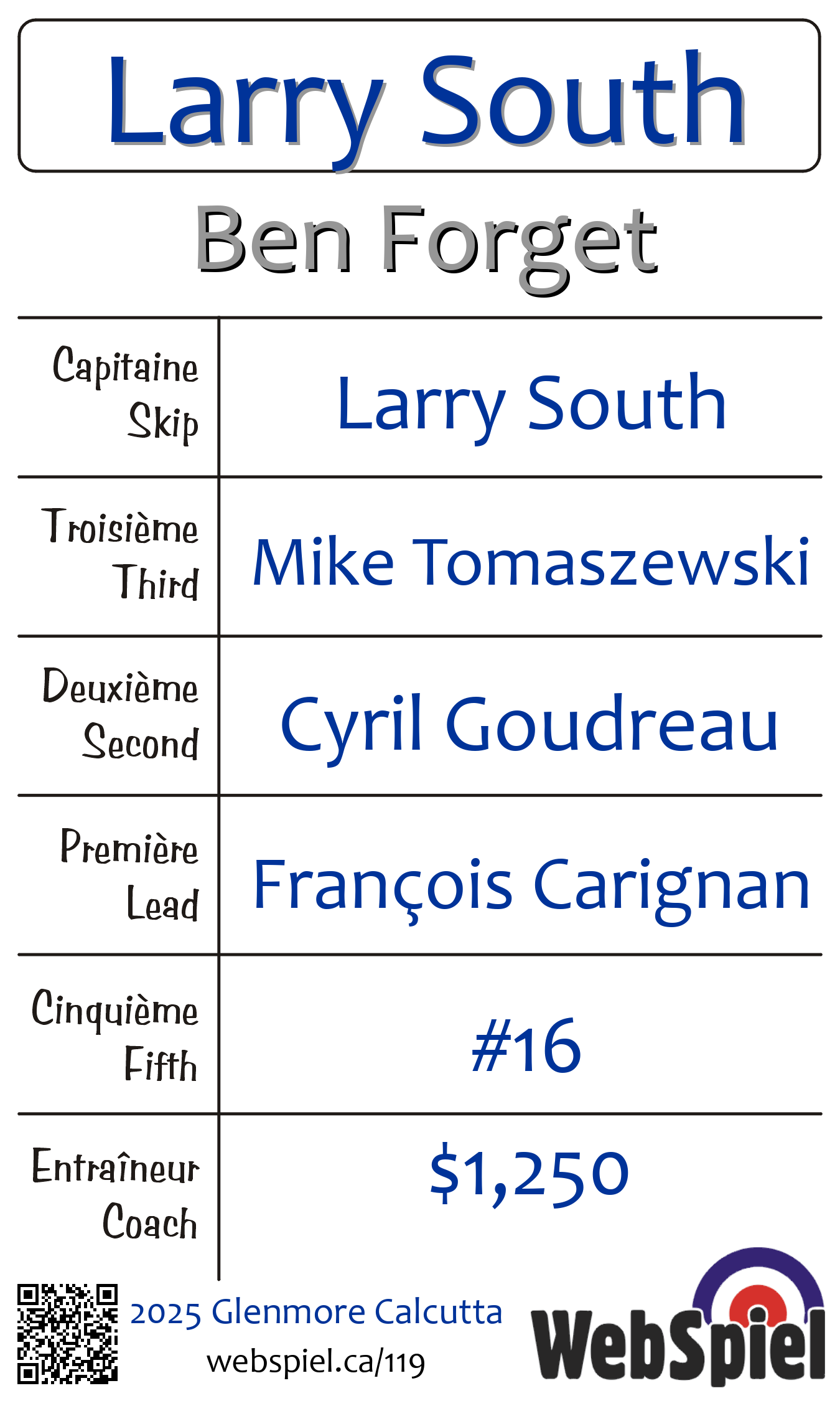 Saturday, February 8th, 2025, at 10:00am EST Glenmore Curling Club, Sheet 214 · D, Winner › B09, Loser › OUT | |||||||||