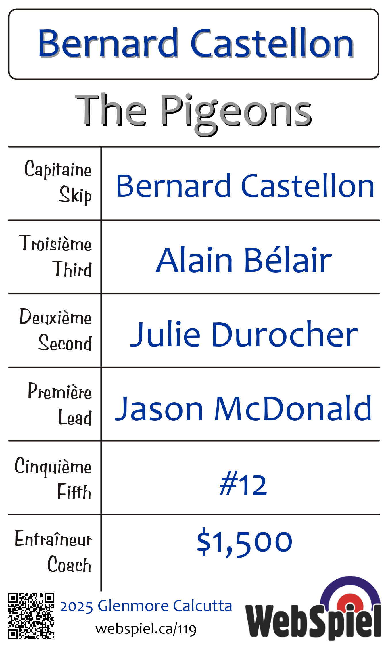 Sunday, February 2nd, 2025, at 4:00pm EST Glenmore Curling Club, Sheet 214 · D, Winner › A16, Loser › C04 | |||||||||