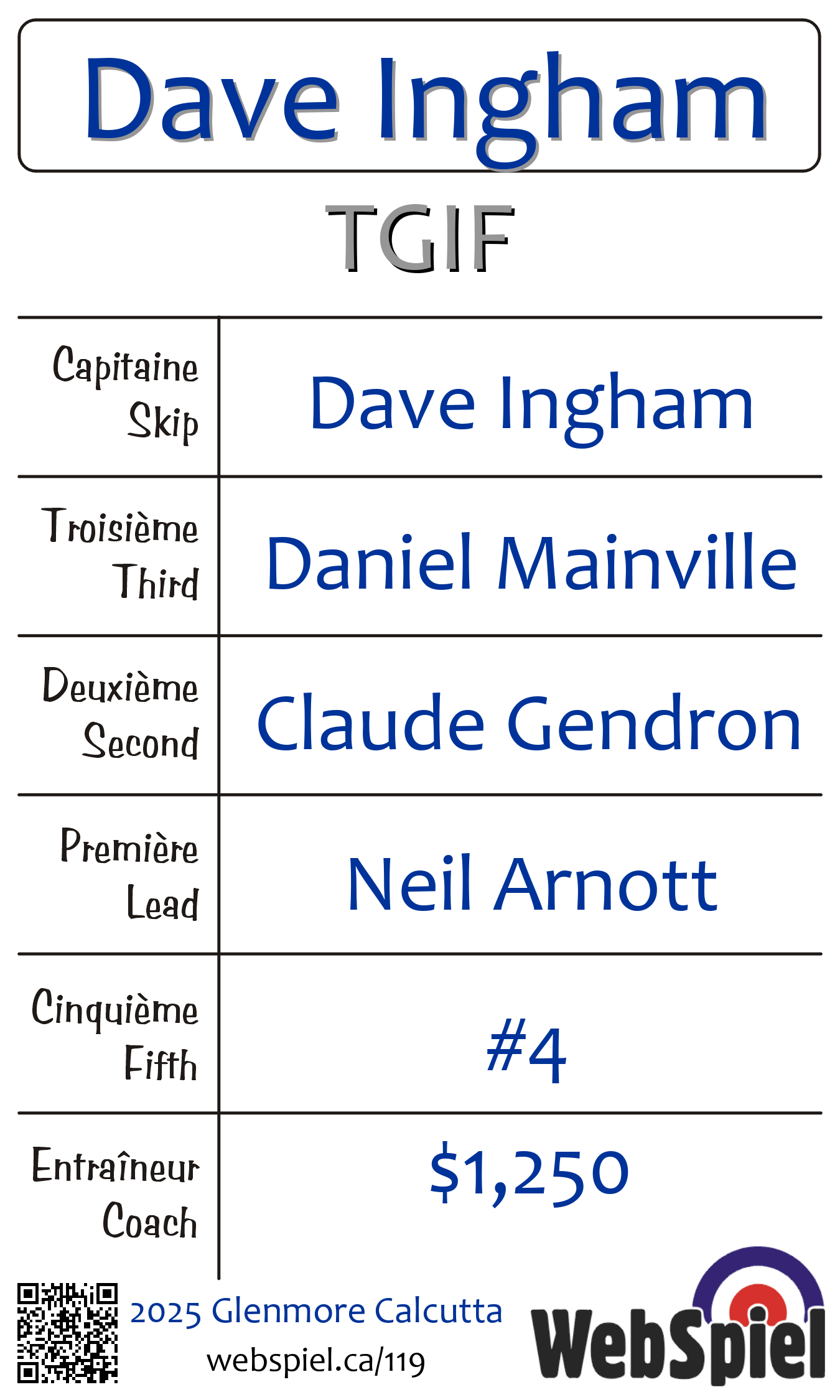Friday, February 7th, 2025, at 7:00pm EST Glenmore Curling Club, Sheet 213 · C, Winner › D07, Loser › OUT | |||||||||