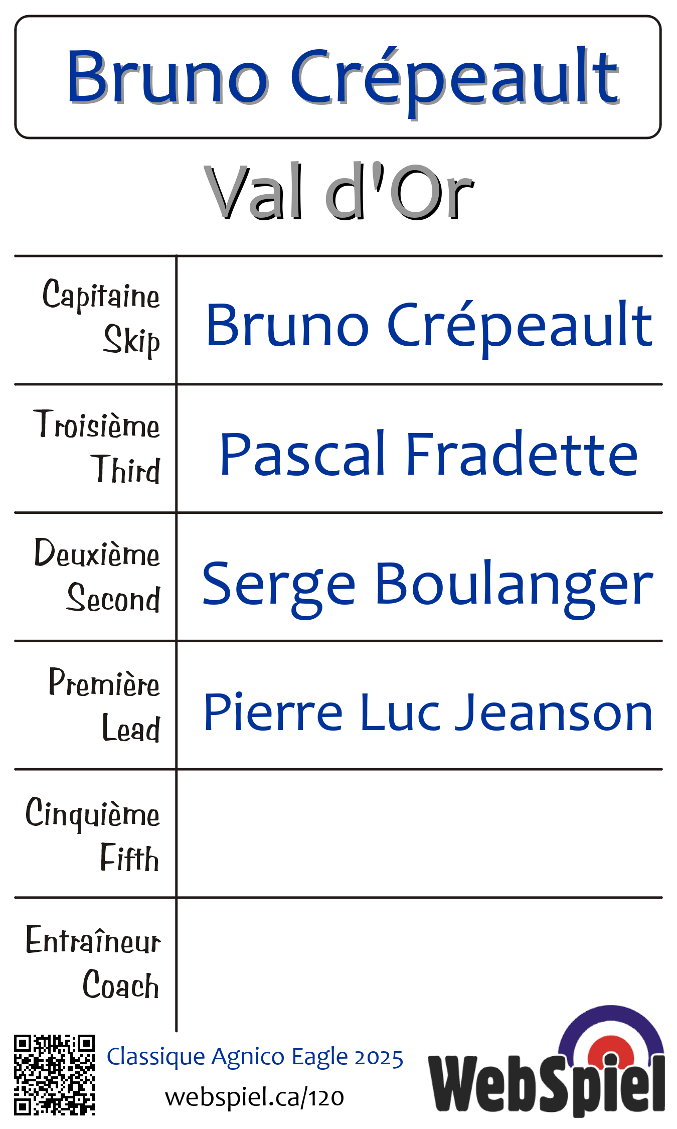 Thursday, February 6th, 2025, at 7:00pm EST Club de curling du Belvédère, Sheet 1 · A, Winner › A17, Loser › C07 | |||||||||