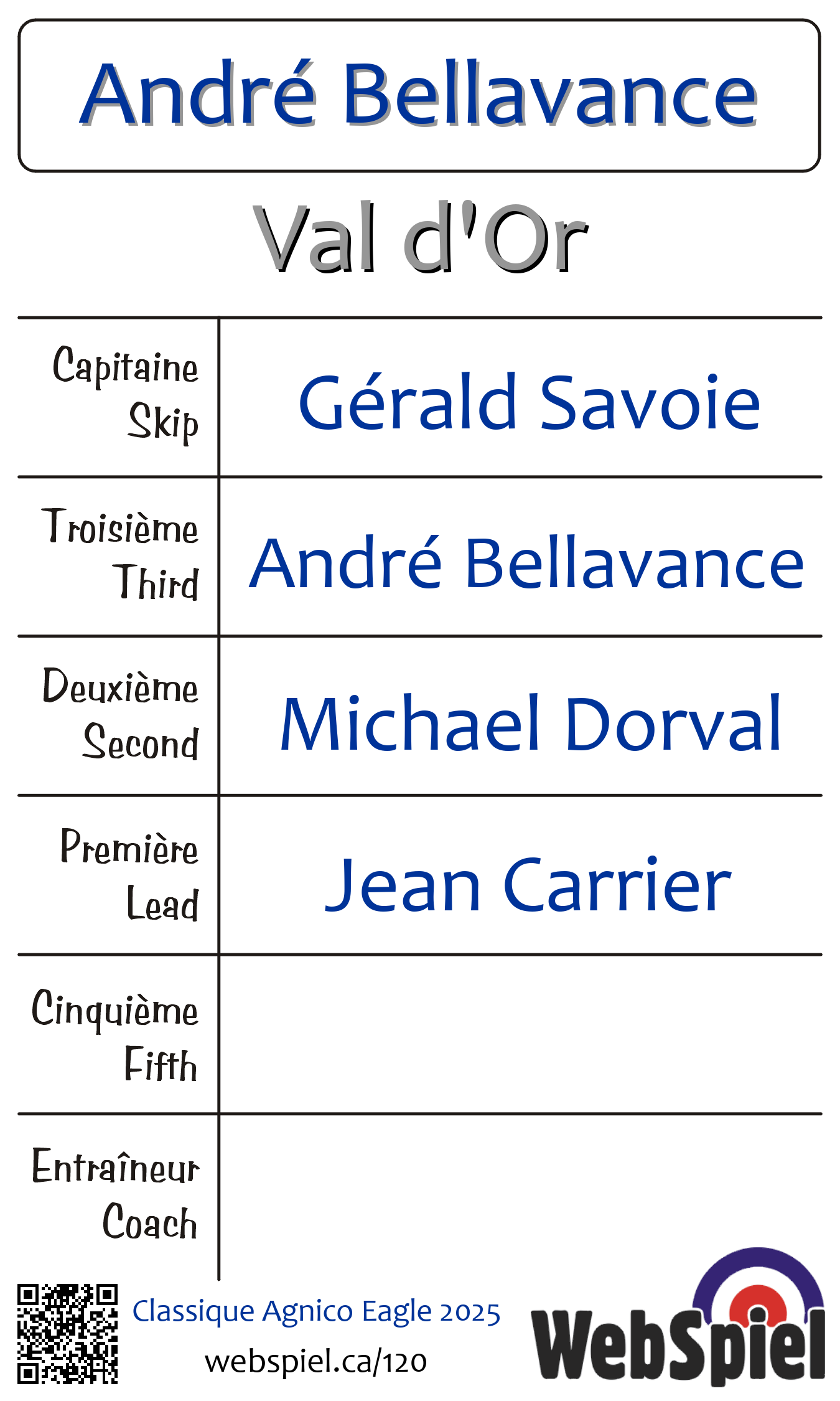 A Semi-FinalSunday, February 9th, 2025, at 10:00am EST Club de curling du Belvédère, Sheet 3 · C, Winner › A31, Loser › OUT | |||||||||