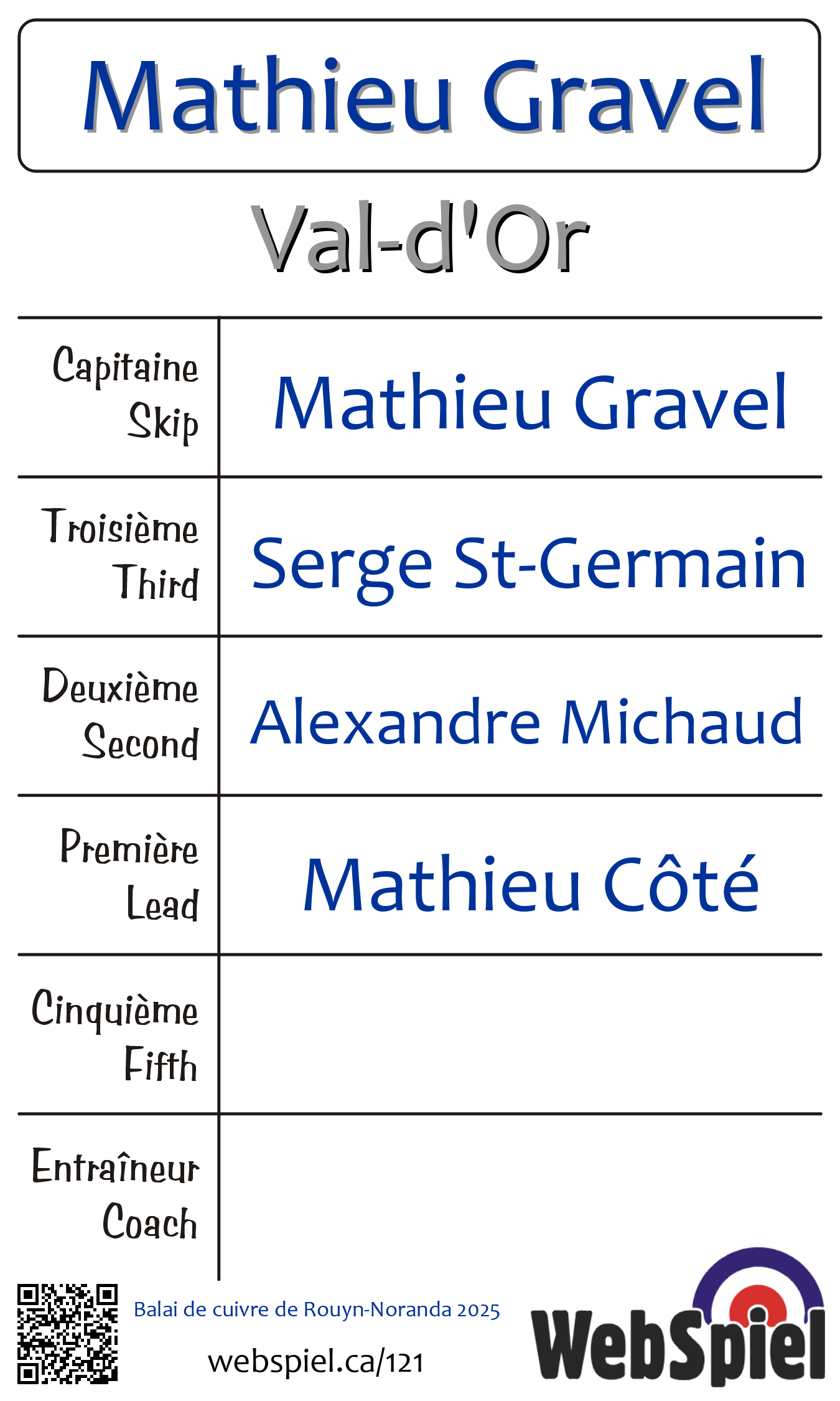 Friday, February 28th, 2025, at 9:00pm EST Club de curling Noranda, Sheet 6 · F, Winner › A30, Loser › C03 | |||||||||