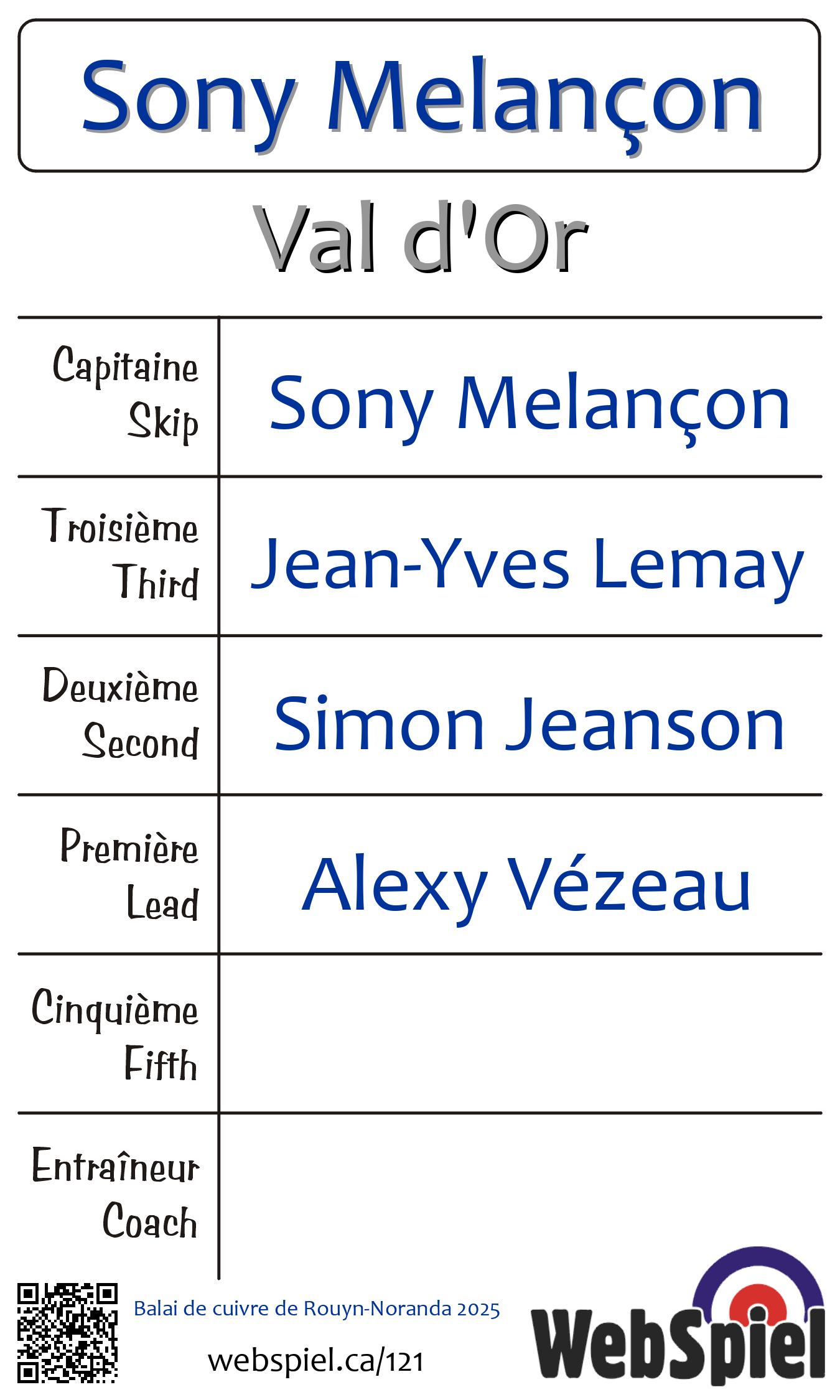 Sunday, March 2nd, 2025, at 8:30am EST Club de curling Noranda, Sheet 4 · D, Winner › A38, Loser › OUT | |||||||||