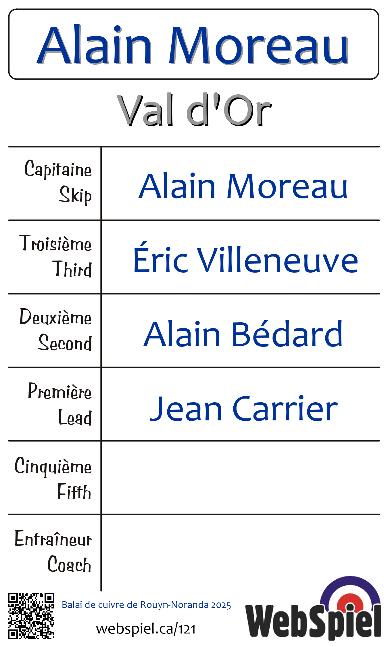 Friday, February 28th, 2025, at 4:30pm EST Club de curling Noranda, Sheet 5 · E, Winner › A32, Loser › C05 | |||||||||