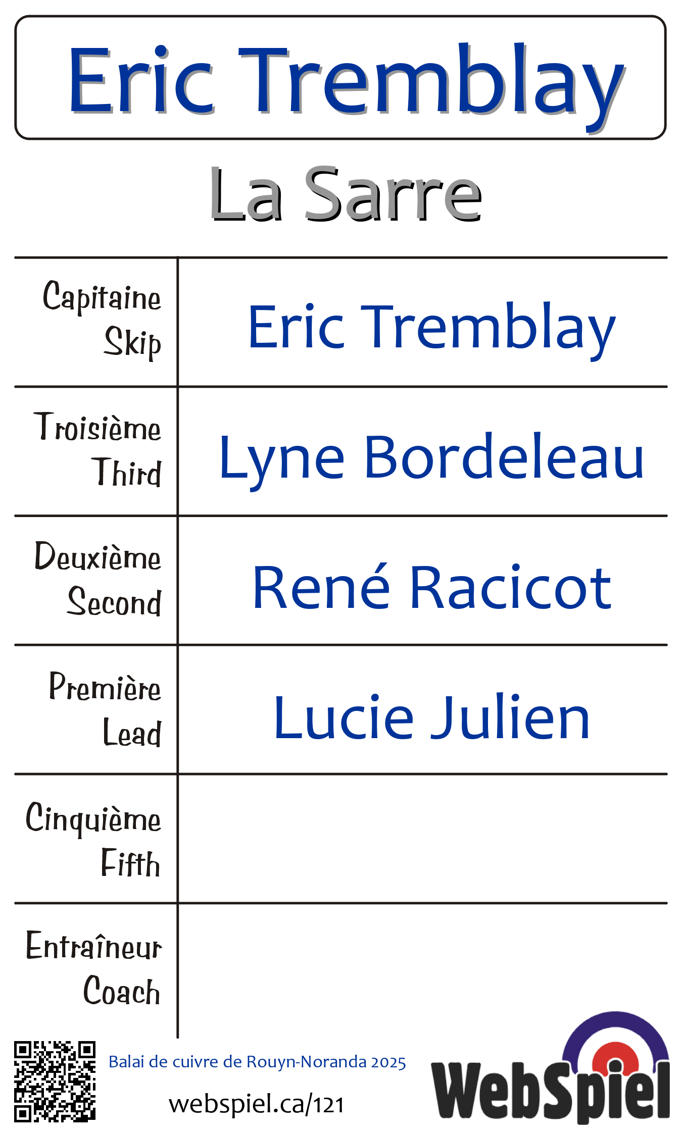 Sunday, March 2nd, 2025, at 1:30pm EST Club de curling Noranda, Sheet 2 · B, Winner › B09, Loser › OUT | |||||||||