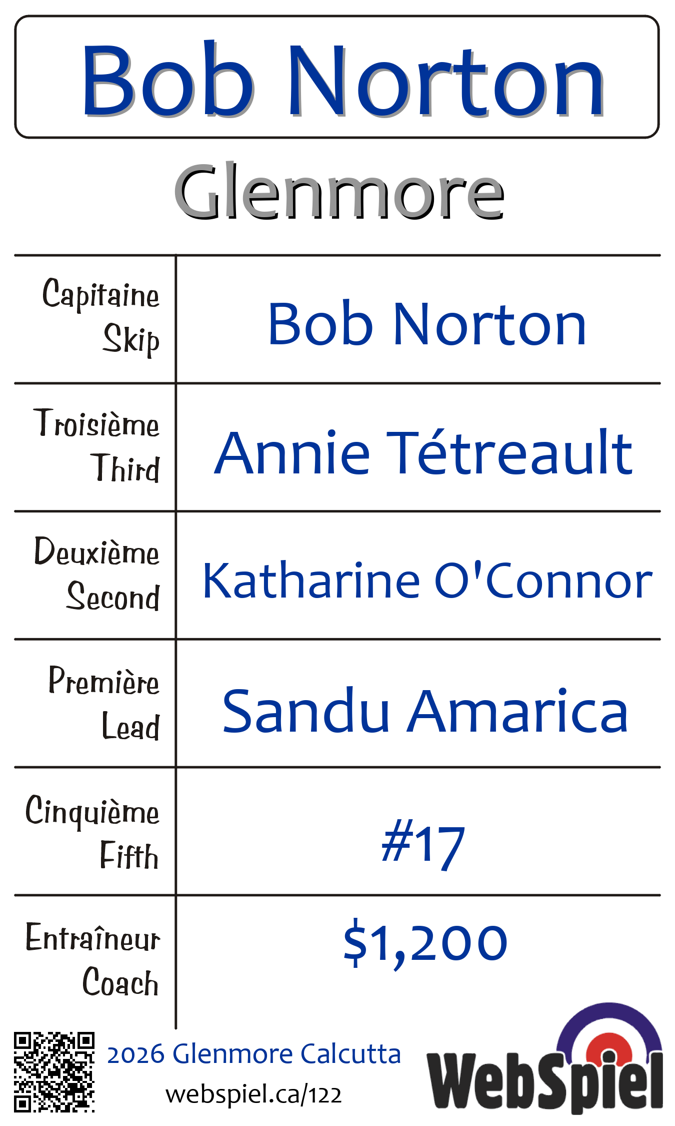 Monday, February 2nd, 2026, at 7:00pm EST Glenmore Curling Club, Sheet 214 · D, Winner › A16, Loser › B02 | |||||||||