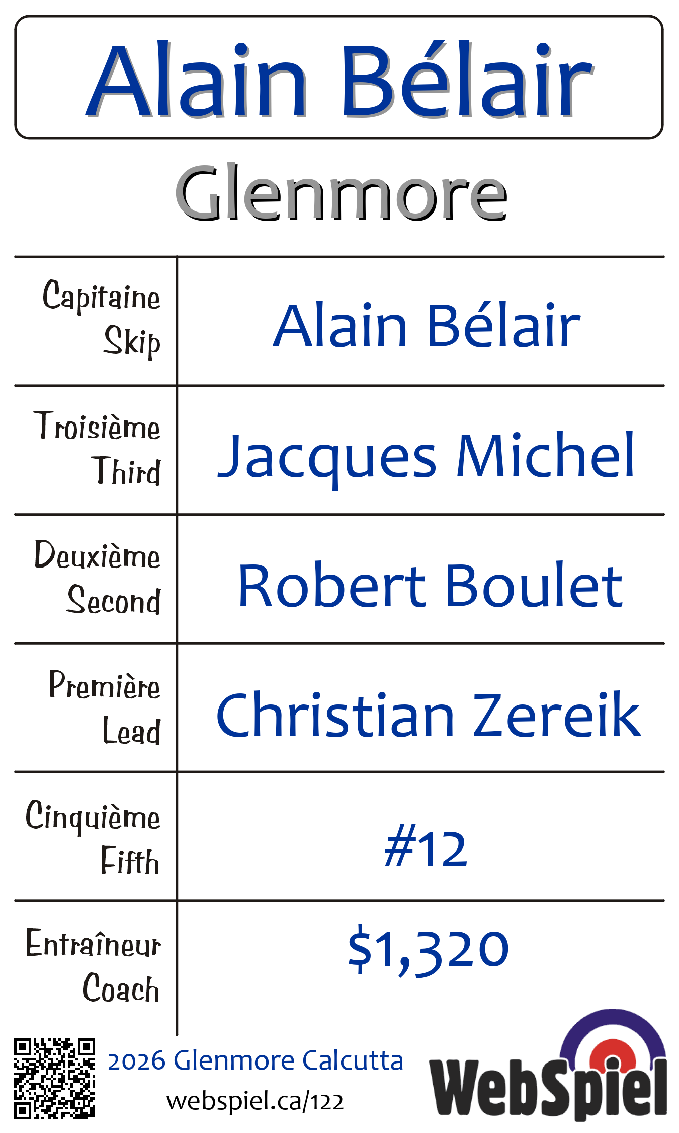 Sunday, February 1st, 2026, at 1:00pm EST Glenmore Curling Club, Sheet 212 · B, Winner › A12, Loser › C04 | |||||||||