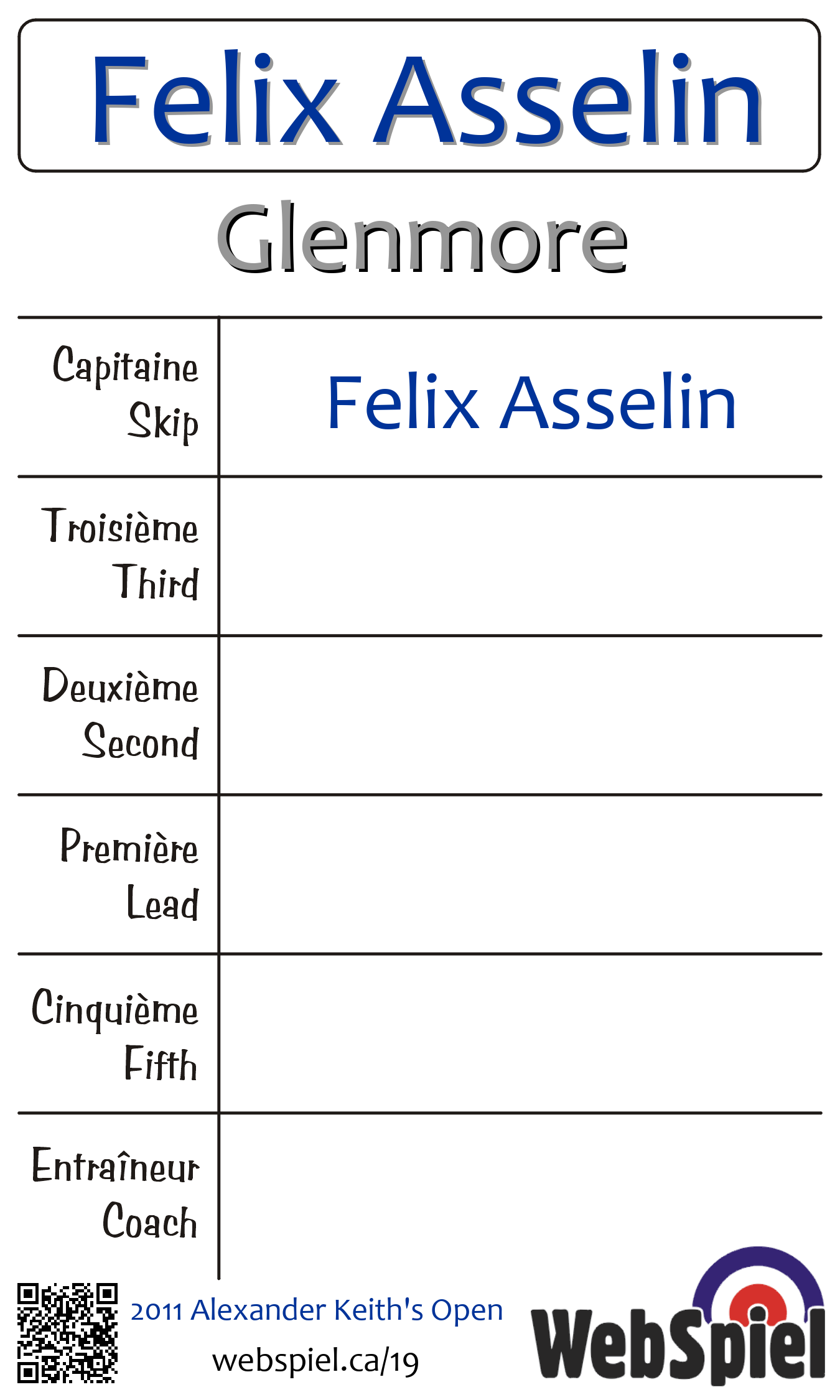 Sunday, December 4th, 2011, at 12:30pm EST Baie d'Urfé Curling Club, Sheet 191, Winner › C17, Loser › OUT | |||||||||