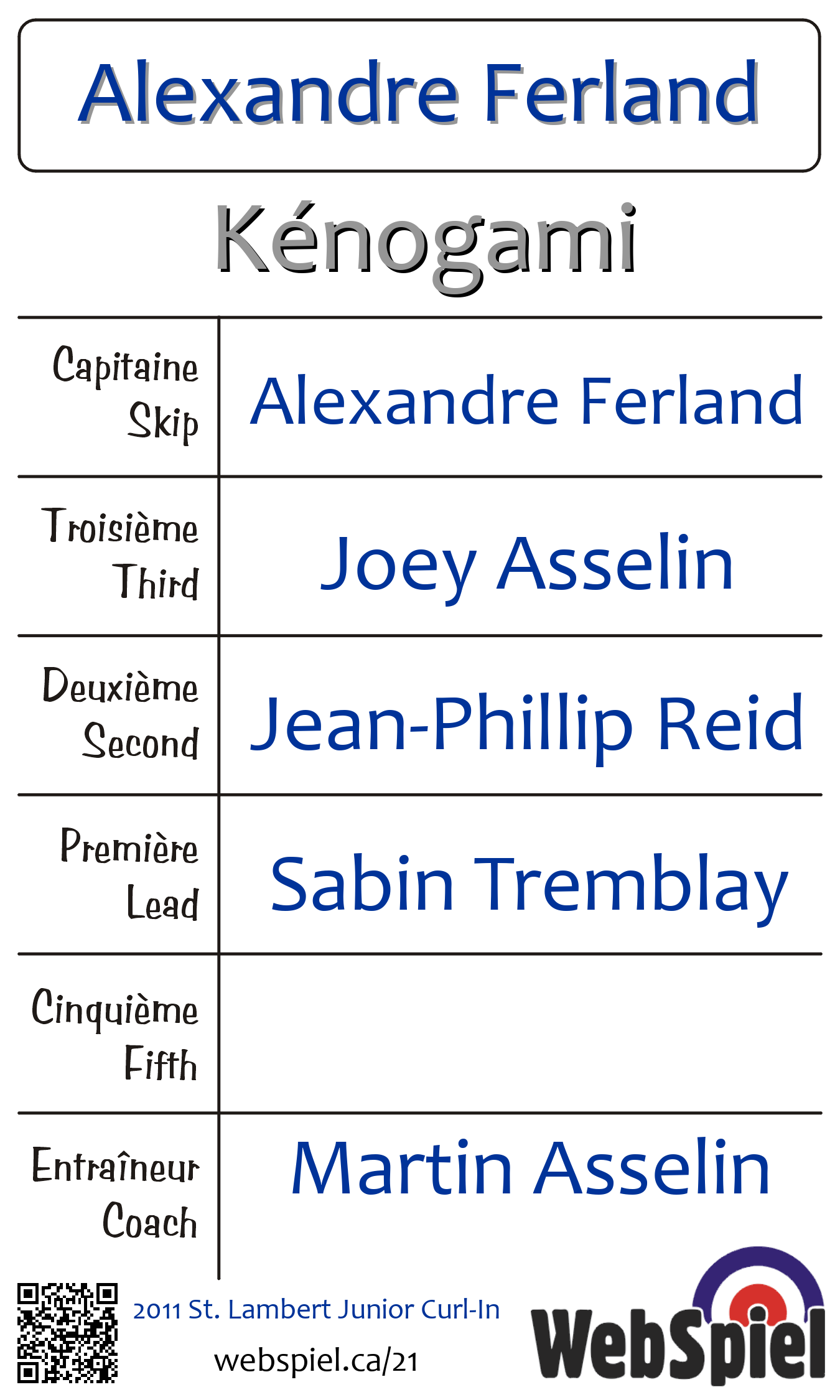 Friday, October 14th, 2011, at 6:30pm EDT Club de curling St-Lambert, Sheet 53 | |||||||||