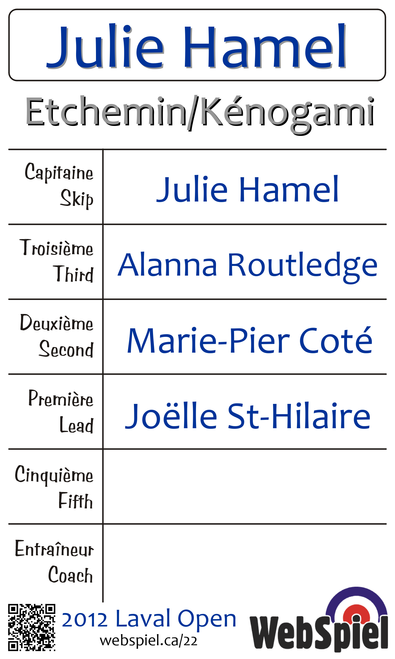 C FinalSunday, January 15th, 2012, at 3:00pm EST Club de curling Laval-sur-le-Lac, Sheet 303 | |||||||||