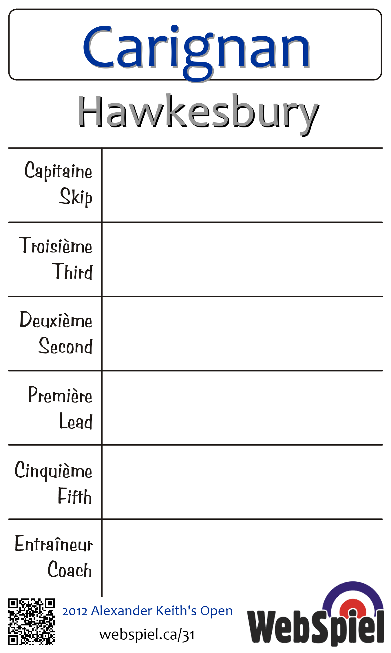Friday, November 30th, 2012, at 5:00pm EST Baie d'Urfé Curling Club, Sheet 192 | |||||||||