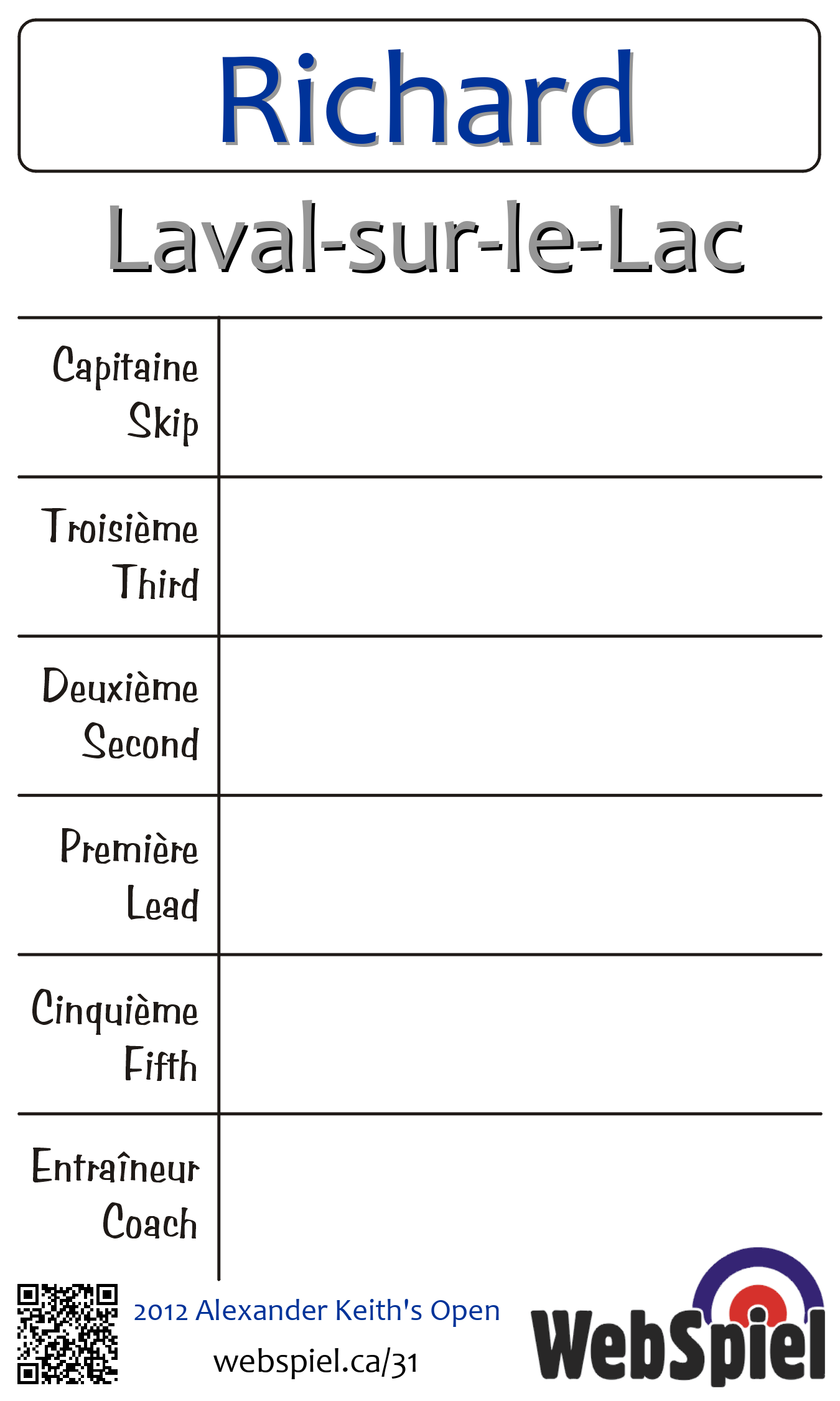 | Club | Laval-sur-le-Lac Club de curling Laval-sur-le-Lac 10 rue les Pins Laval-sur-le-Lac, QC H7R 1C7 CANADA T: 450-627-4791 F: 450-627-7511 http://www.curlinglaval.ca 3 sheets |