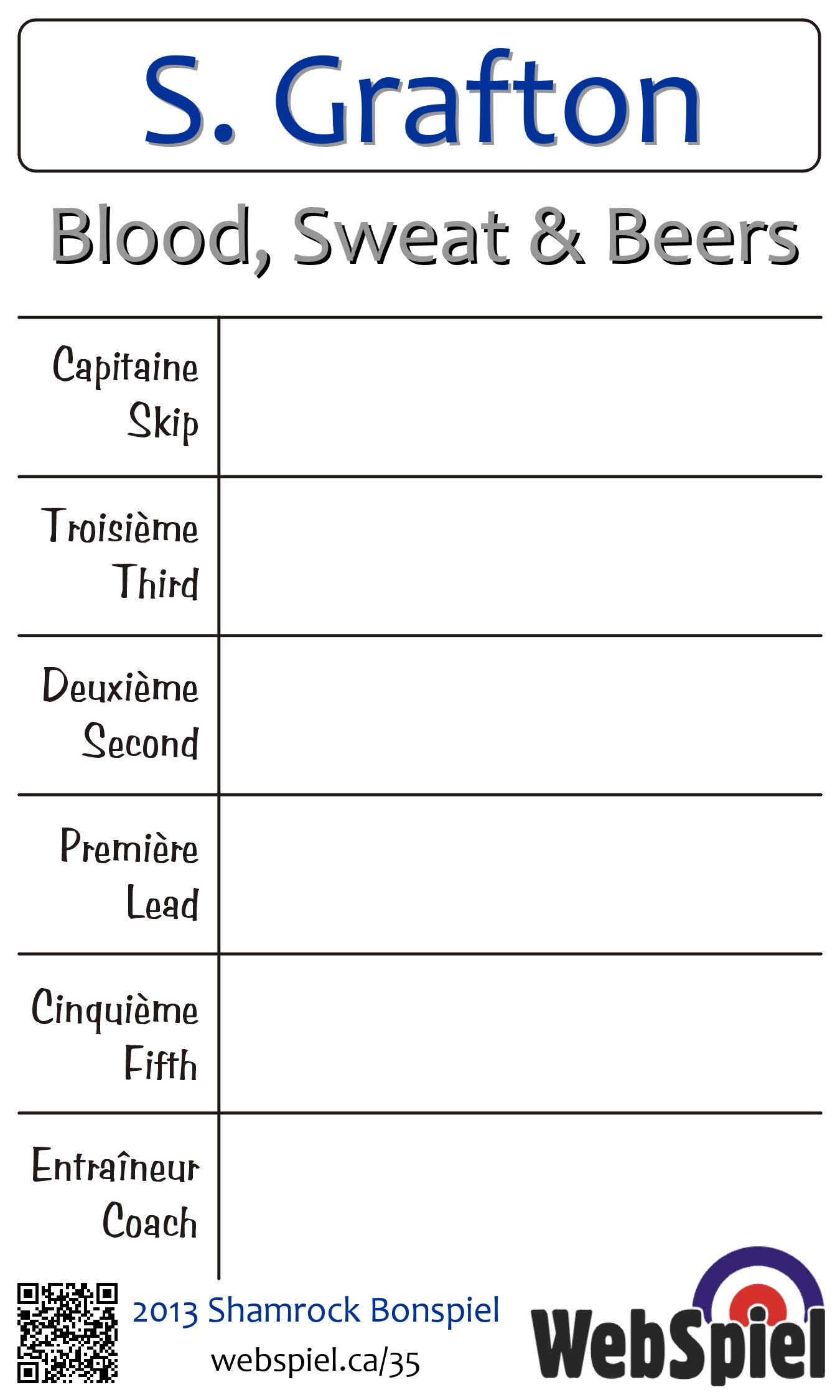 | Club | Blood, Sweat & Beers Montreal West Curling Club 17 Ainslie Road Montréal ouest, QC H4X 1K4 CANADA T: 514-486-5831 http://mtlwestcurl.org/ 4 sheets |