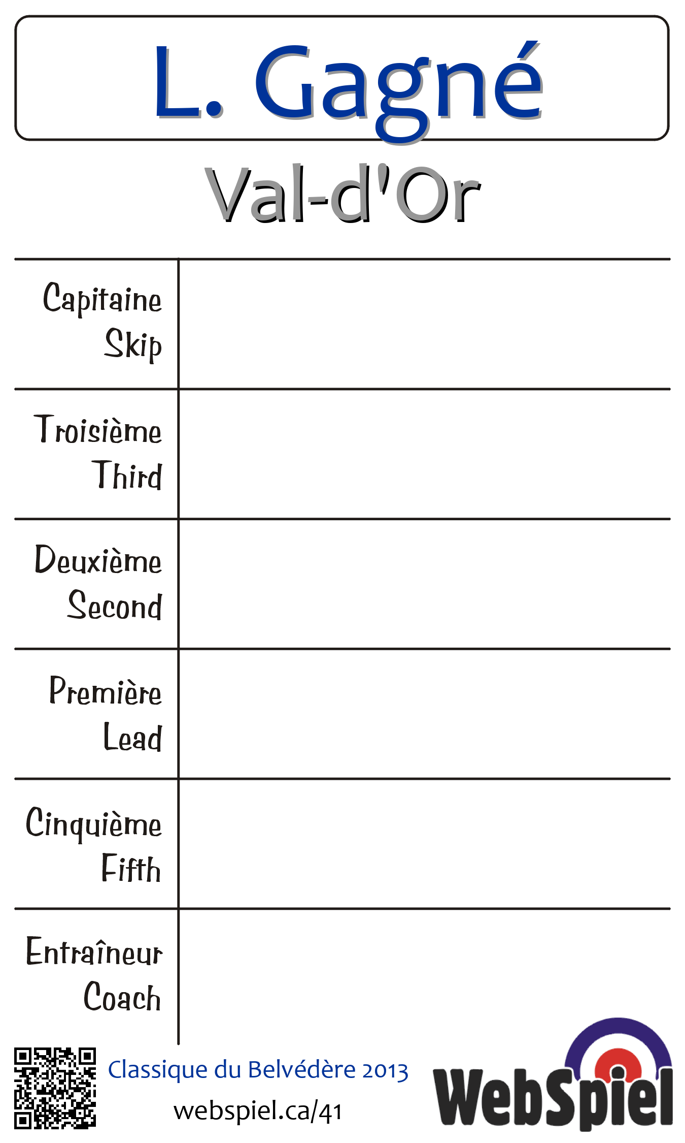 | Club | Val-d'Or Club de curling du Belvédère 360, boul. Sabourin Val-d'Or, QC J9P 4N9 CANADA T: 819-824-5090 F: 819-824-4454 4 sheets |