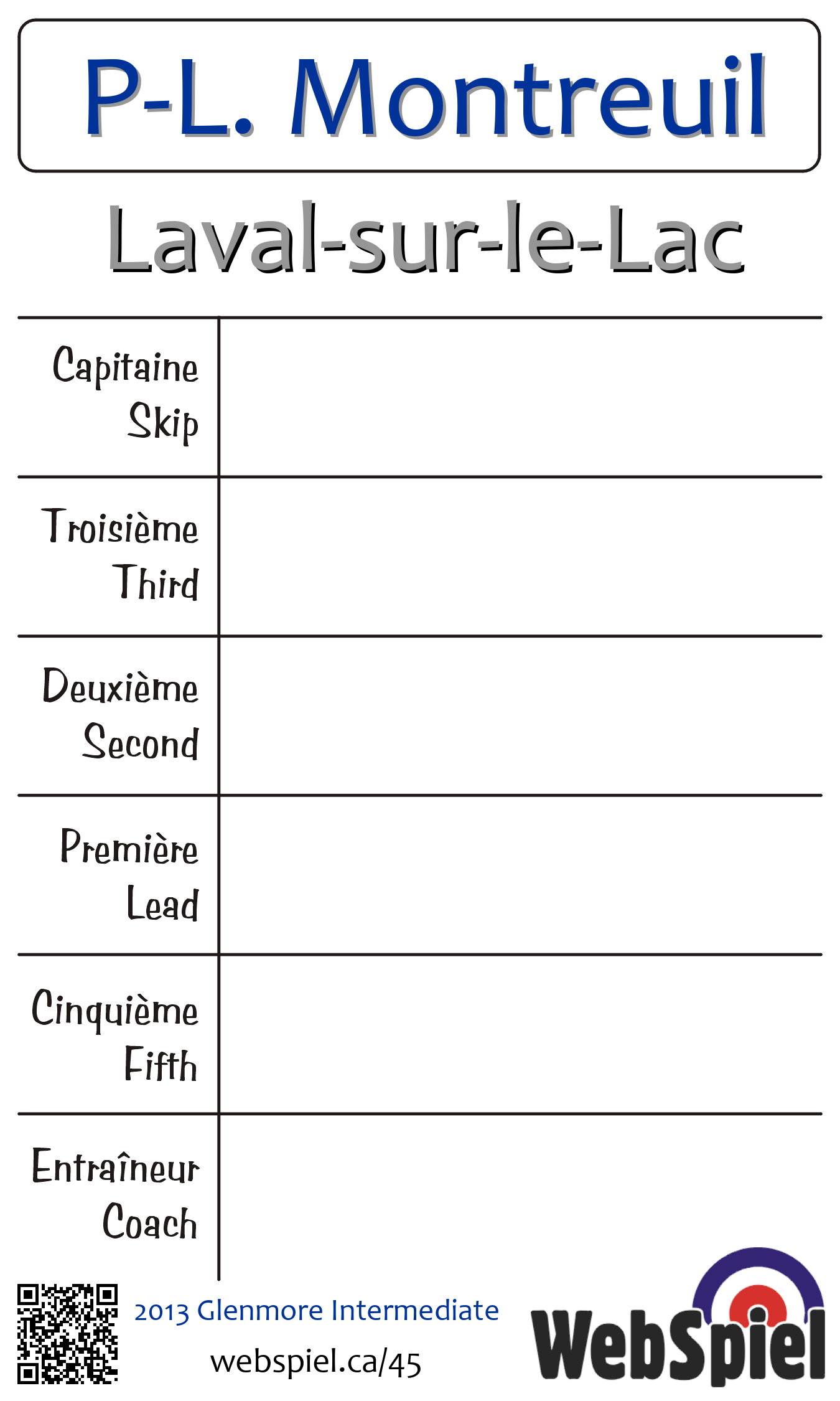 | Club | Laval-sur-le-Lac Club de curling Laval-sur-le-Lac 10 rue les Pins Laval-sur-le-Lac, QC H7R 1C7 CANADA T: 450-627-4791 F: 450-627-7511 http://www.curlinglaval.ca 3 sheets |