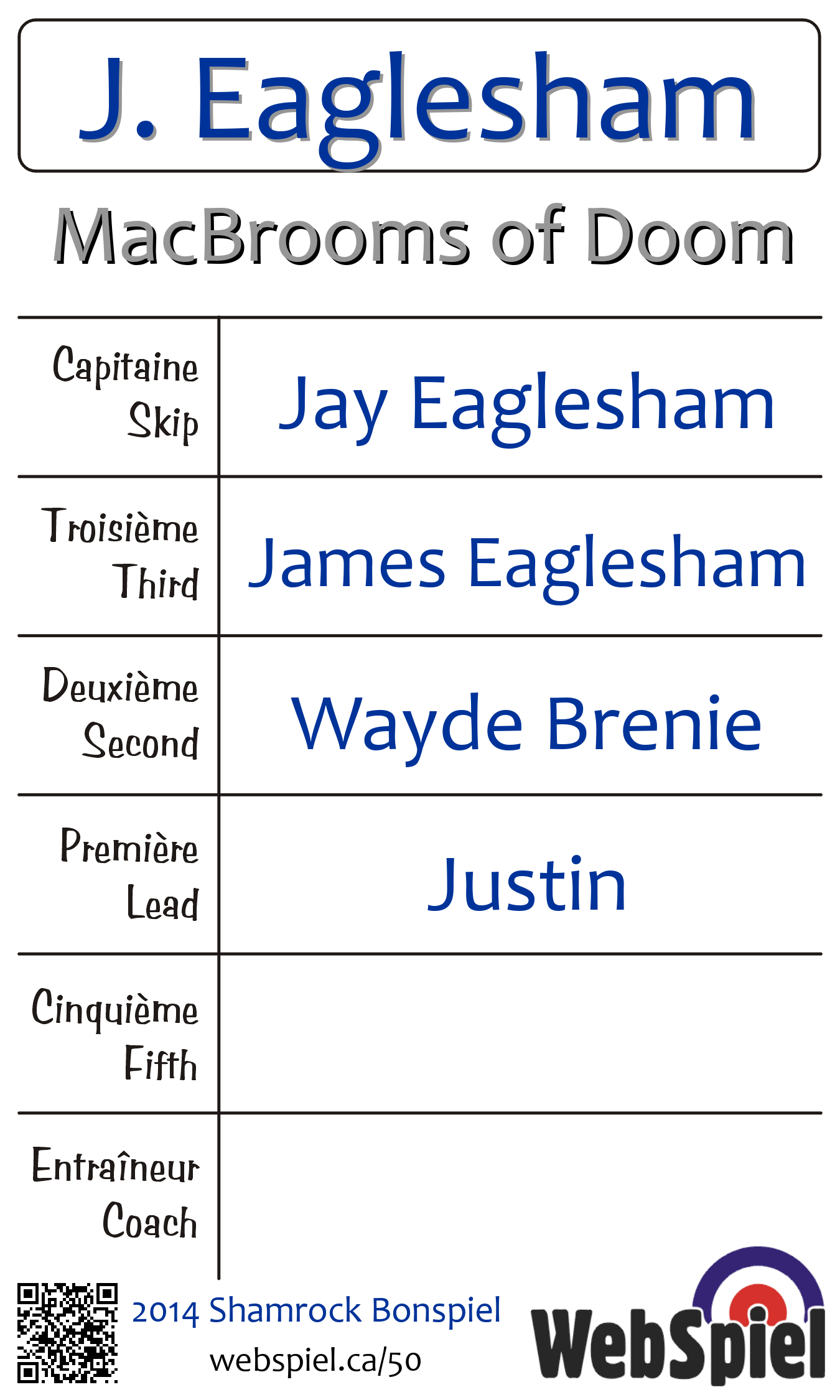 | Club | MacBrooms of Doom Montreal West Curling Club 17 Ainslie Road Montréal ouest, QC H4X 1K4 CANADA T: 514-486-5831 http://mtlwestcurl.org/ 4 sheets |