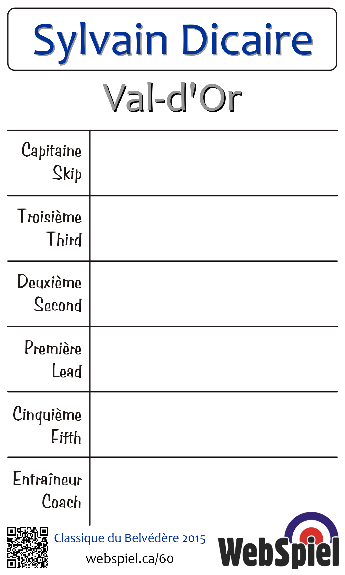 | Club | Val-d'Or Club de curling du Belvédère 360, boul. Sabourin Val-d'Or, QC J9P 4N9 CANADA T: 819-824-5090 F: 819-824-4454 4 sheets |