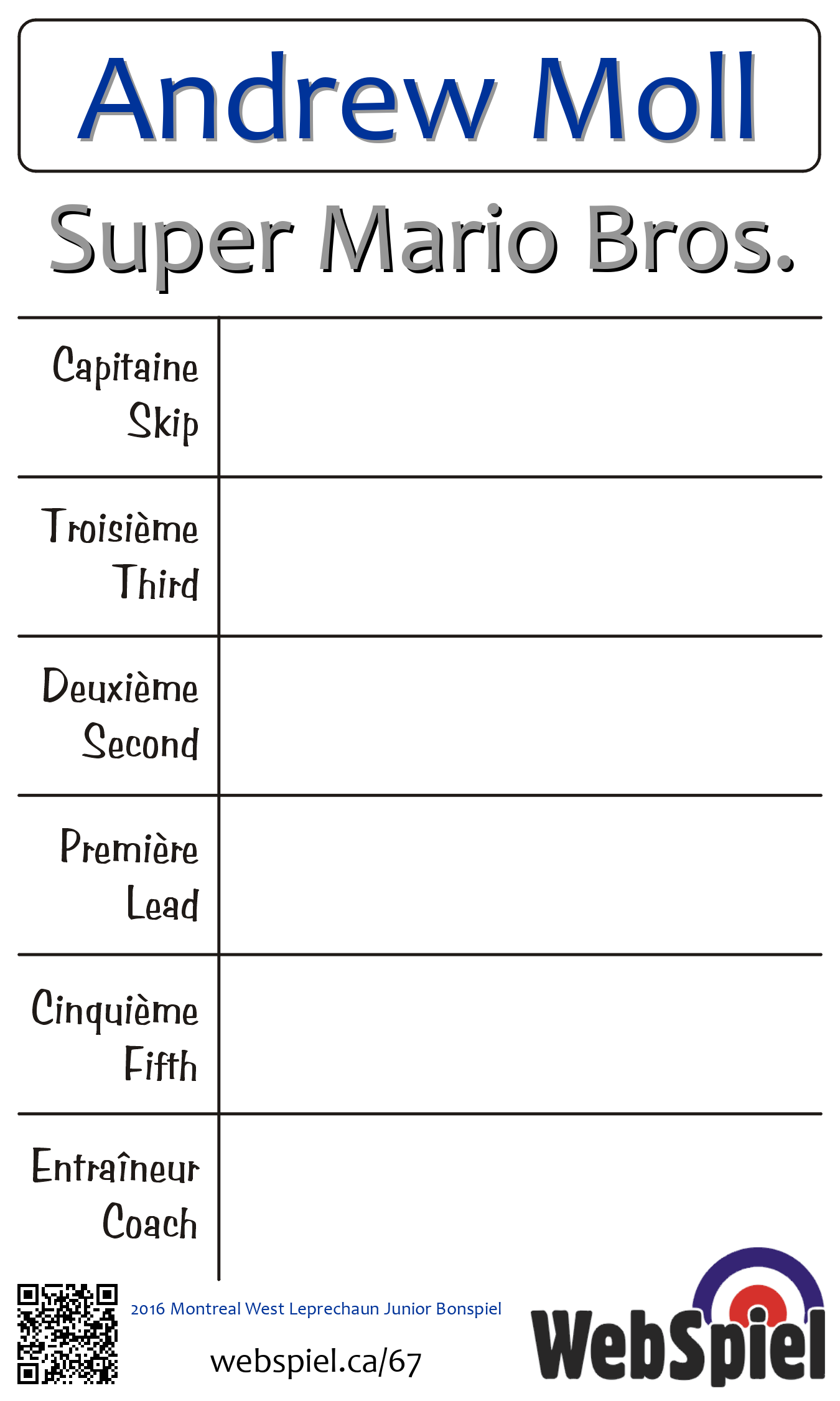 | Club | Super Mario Bros. Club de curling Hudson Legion Sandy Beach Hudson, QC J0P 1J0 CANADA T: 450-458-4882 2 sheets |