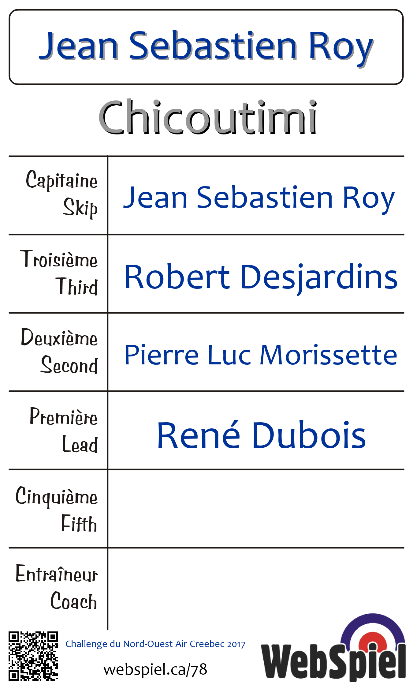 | Club | Chicoutimi Club de curling Chicoutimi 760, Jolliet C.P. 454 Chicoutimi, QC G7H 5C8 CANADA T: 418-549-9245 F: 418-549-0683 http://www.curlingchicoutimi.ca |