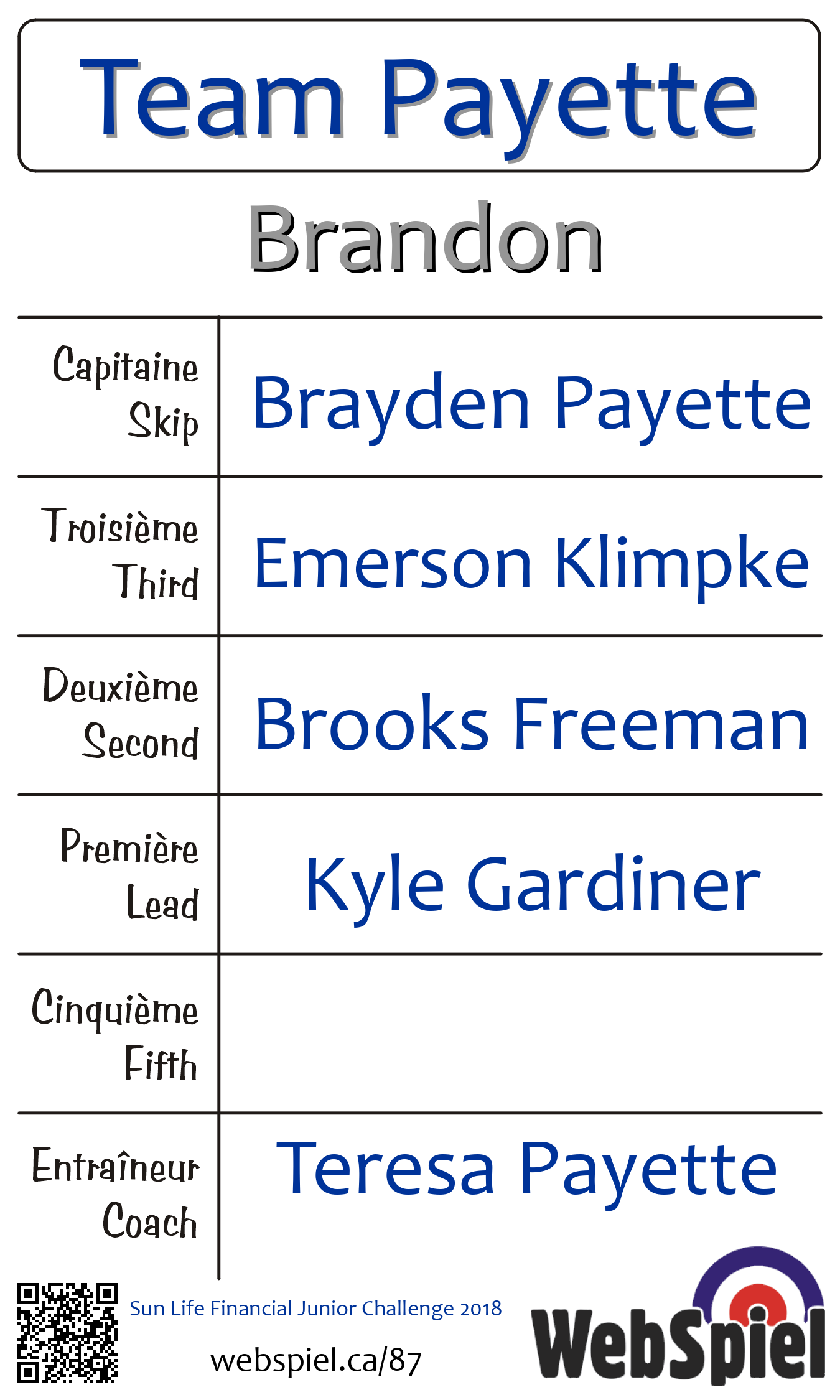 Saturday, November 17th, 2018, at 9:00am CST Brandon Curling Club, Sheet 8 | |||||||||