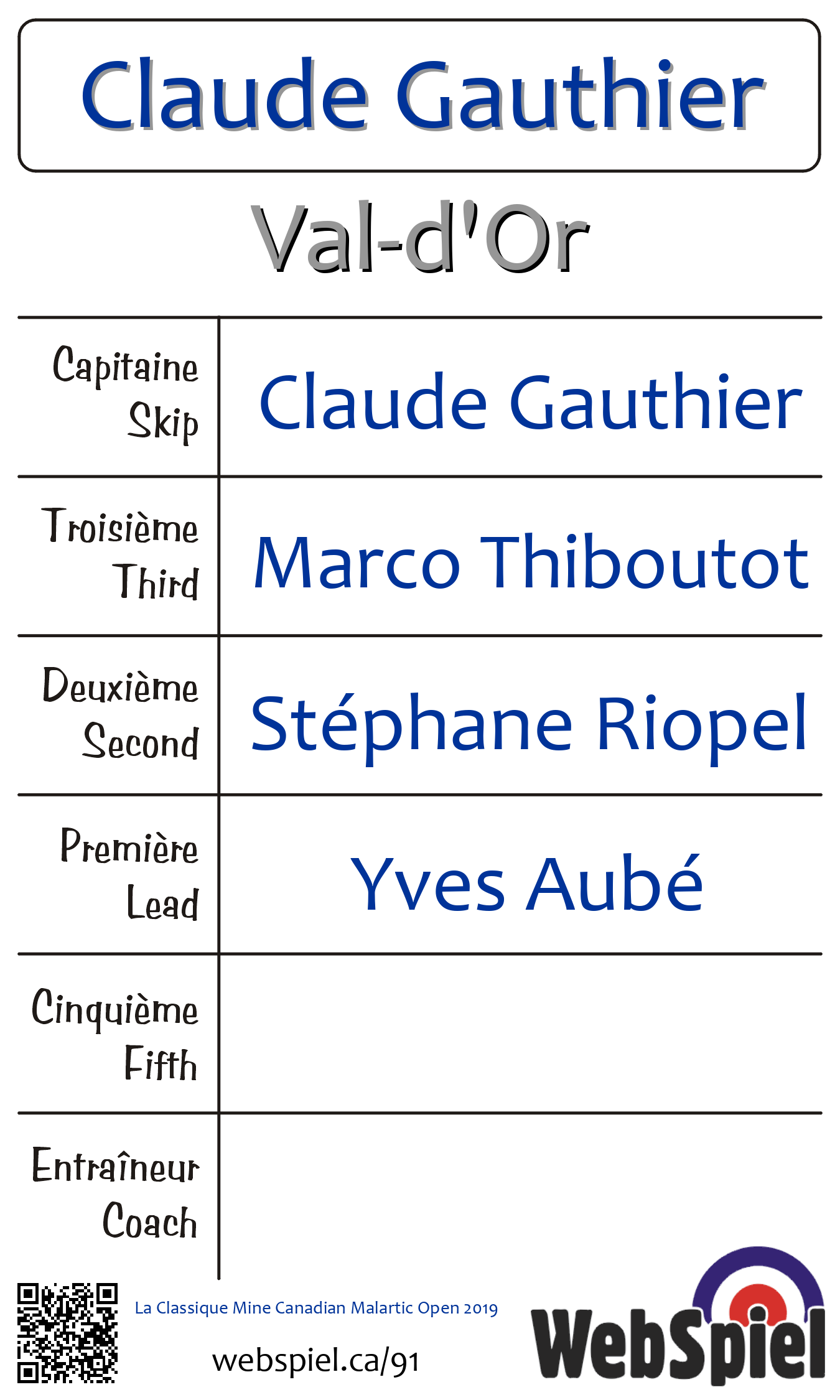 Sunday, February 17th, 2019, at 12:00am EST Club de curling du Belvédère, Sheet 3 · C, Winner › B05, Loser › OUT | ||||||||||