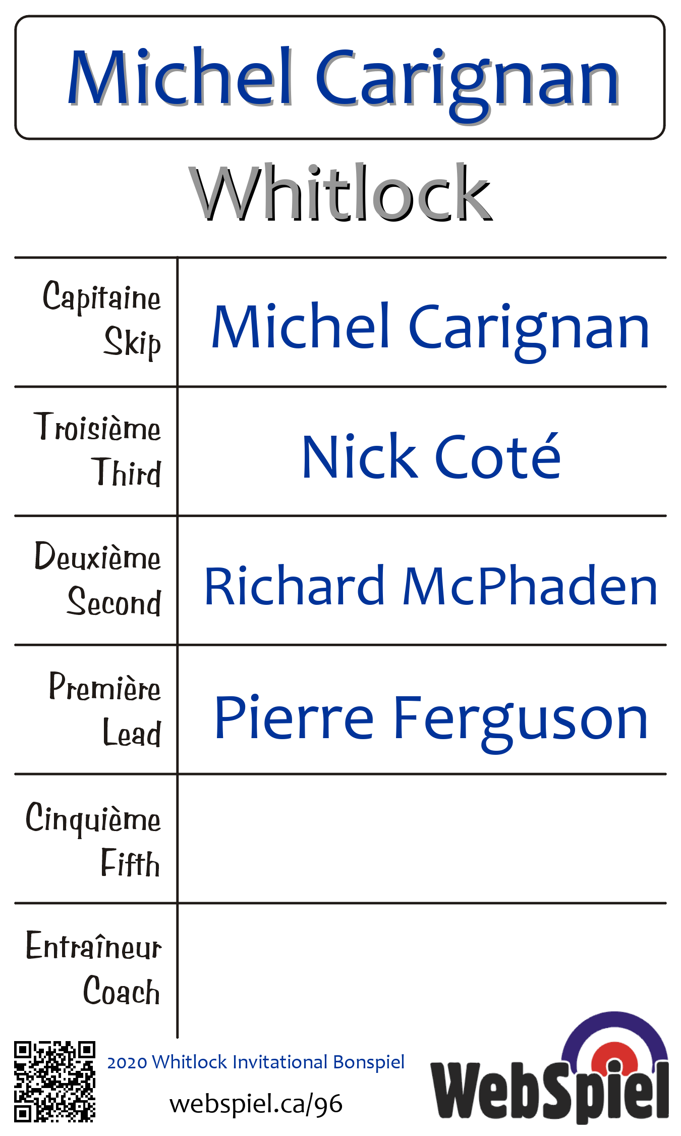 Saturday, January 11th, 2020, at 6:00pm EST Club de curling Hudson Whitlock, Sheet 1, Winner › B12, Loser › OUT | |||||||||