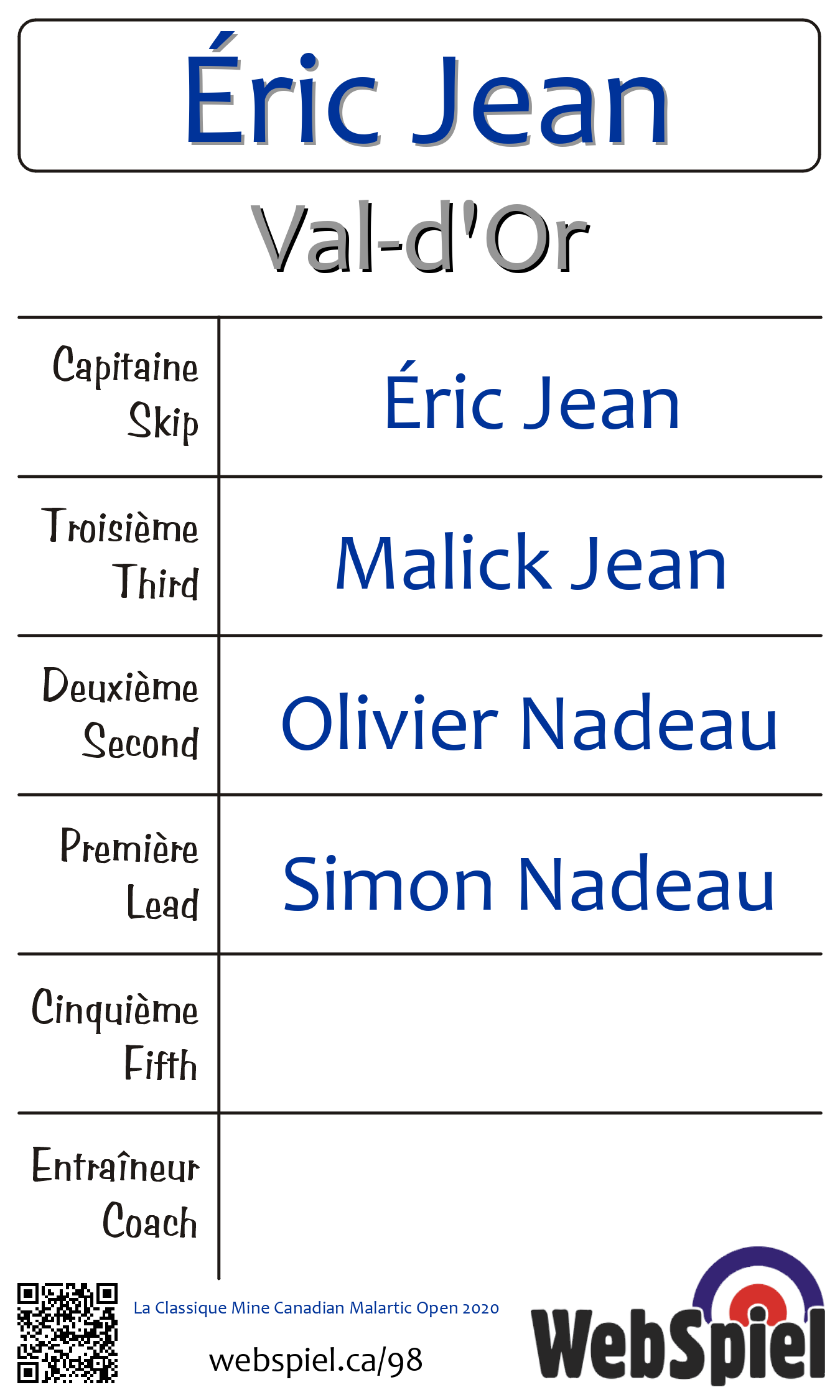 Saturday, February 22nd, 2020, at 7:30pm EST Club de curling du Belvédère, Sheet 4 · D, Winner › D05, Loser › OUT | |||||||||