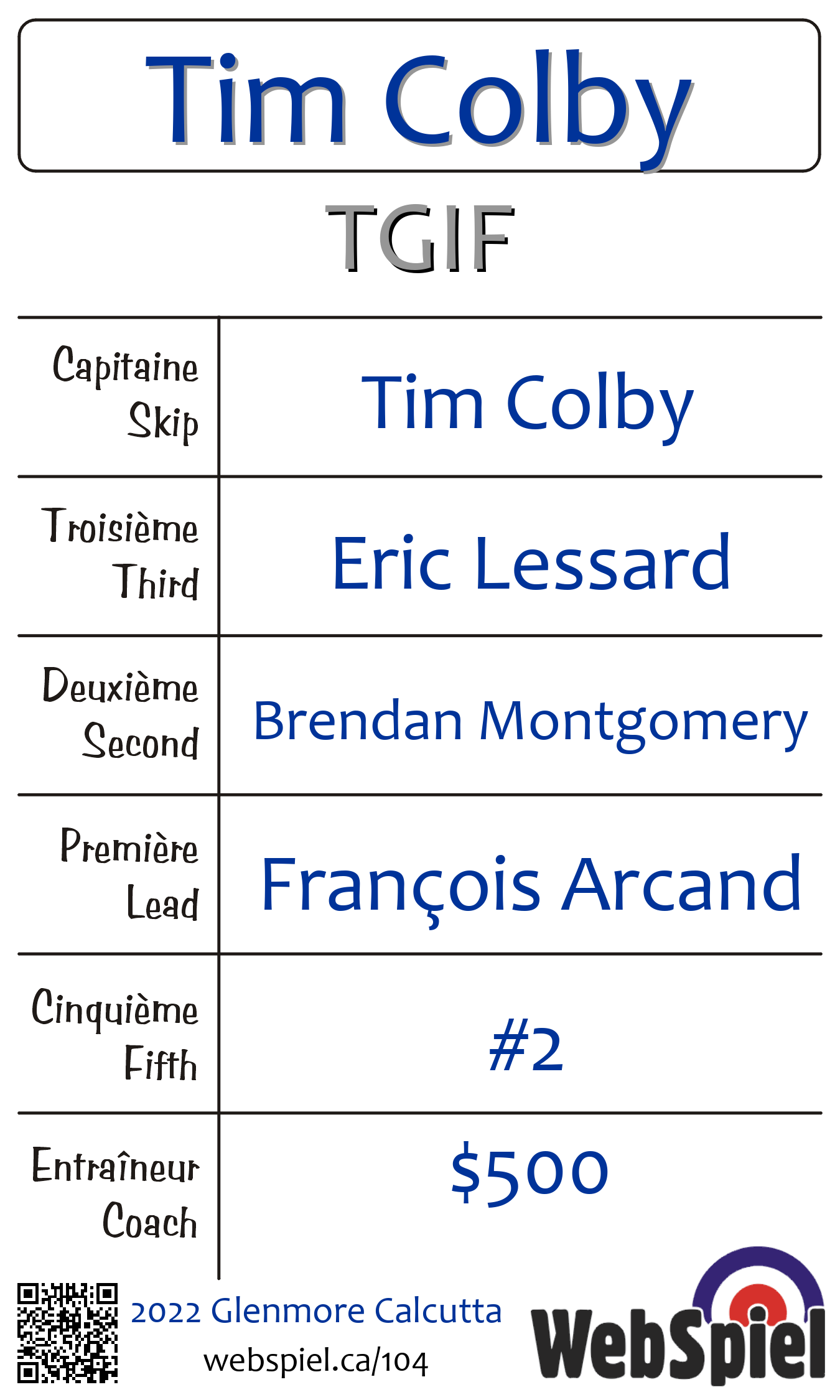 | Club | TGIF Glenmore Curling Club 120 rue Glenmore Dollard-des-Ormeaux, QC H9B 2X9 CANADA T: 514-684-6350 F: 514-684-6352 http://www.glenmorecurling.com 4 glaces |