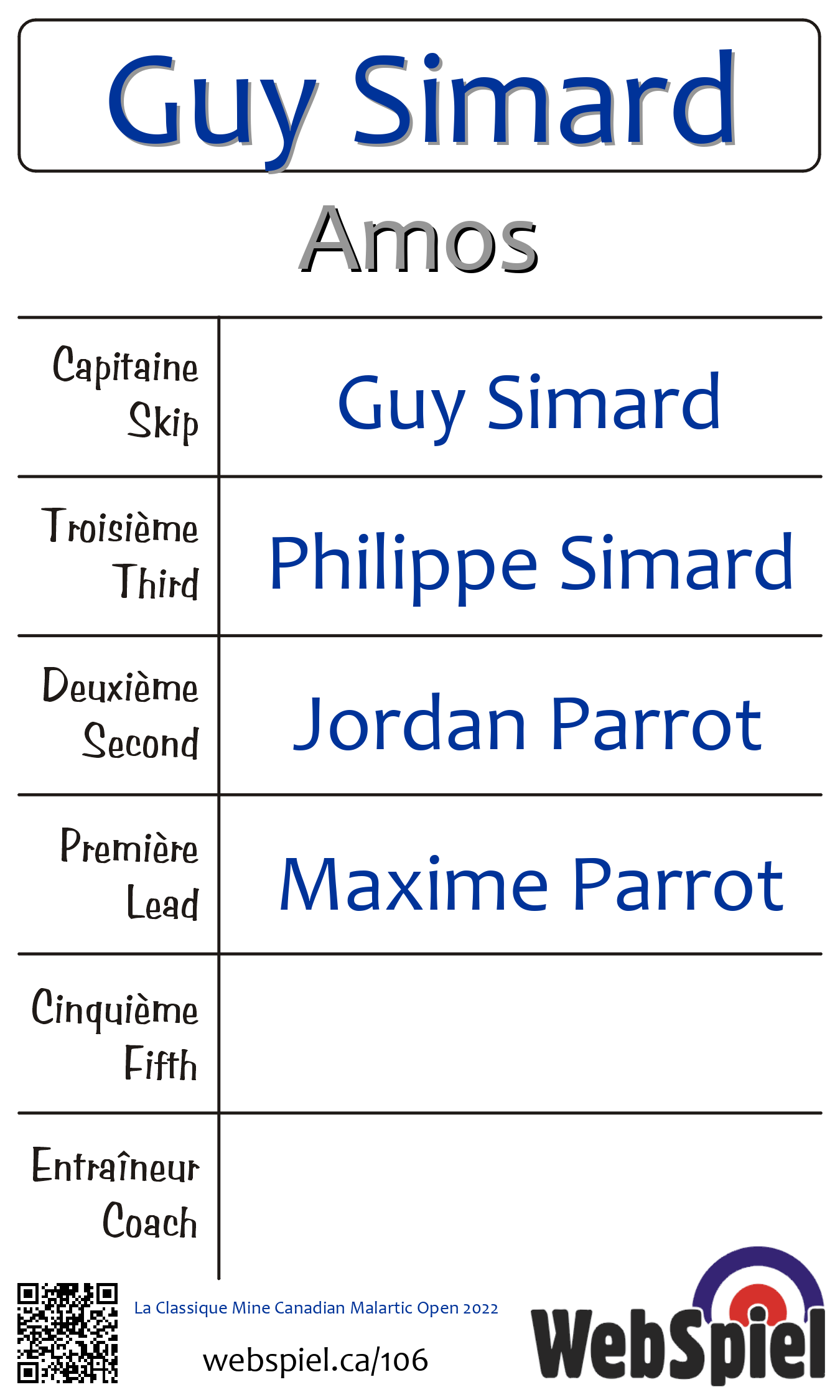 Vendredi le 8 avril 2022, à 20h00 EDT Club de curling du Belvédère, Glace 3 · C, Gagnant › A19, Perdant › C03 | |||||||||
