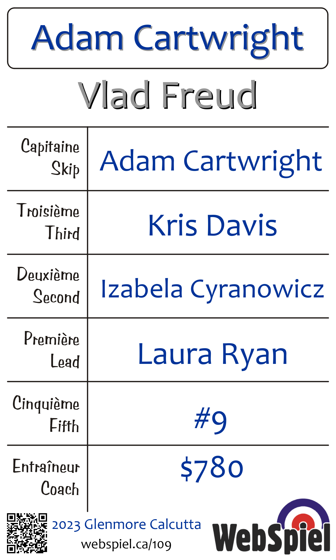 | Équipe | 15 - Adam Cartwright |