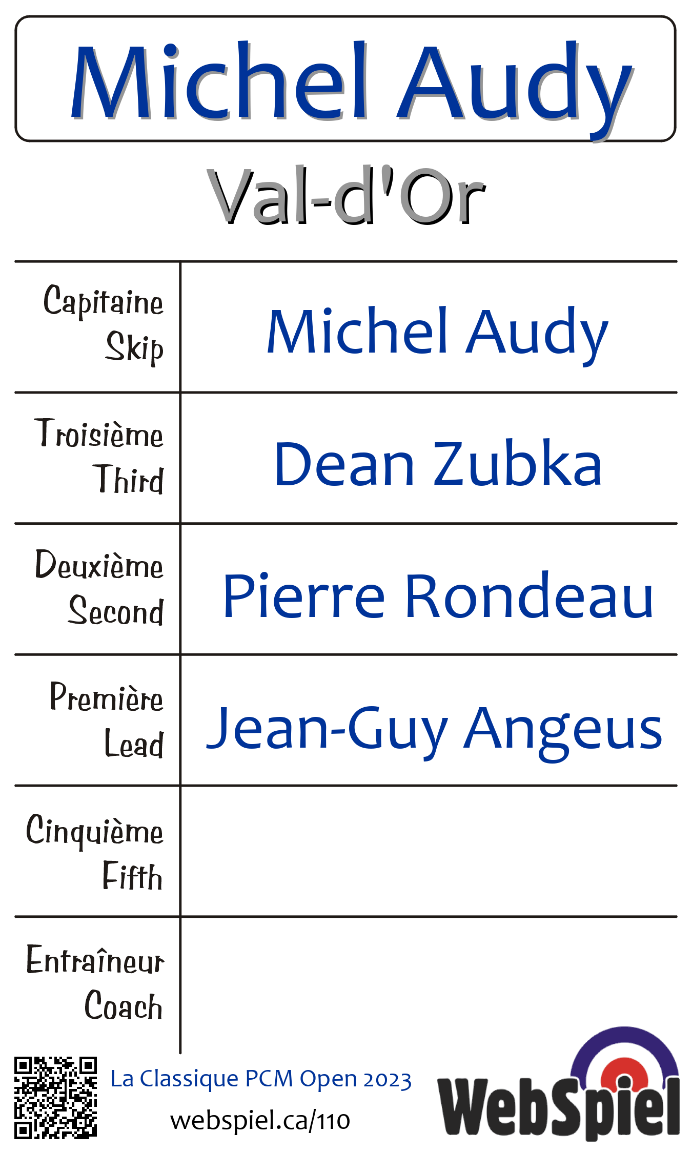 Samedi le 18 février 2023, à 17h00 EST Club de curling du Belvédère, Glace 1 · A, Gagnant › D05, Perdant › Éliminé | |||||||||