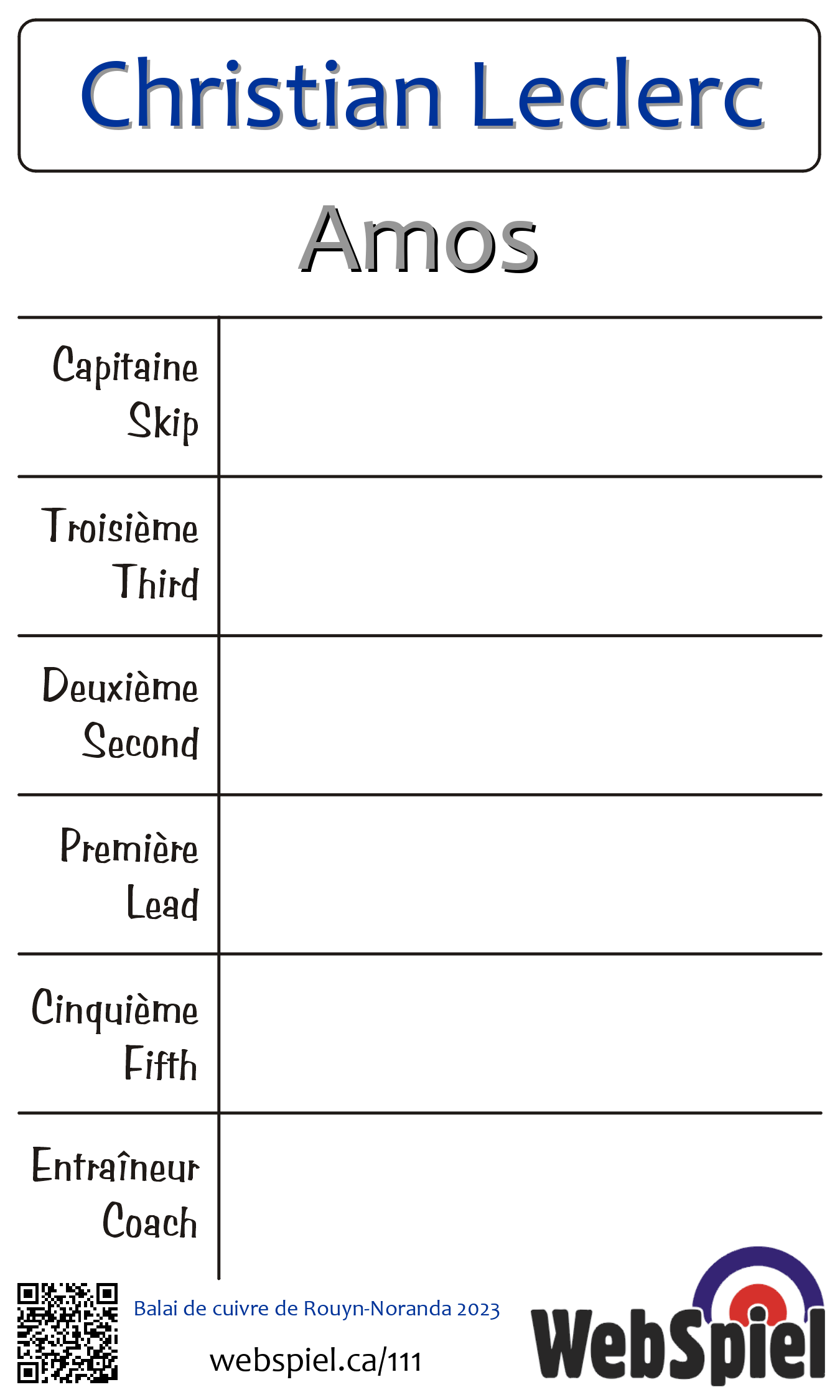 | Club | Amos Club de curling d'Amos 182 10e Avenue Est Amos, QC J9T 1H9 CANADA T: 819-732-6272 F: 819-732-1617 http://www.clubcurlingamos.com |