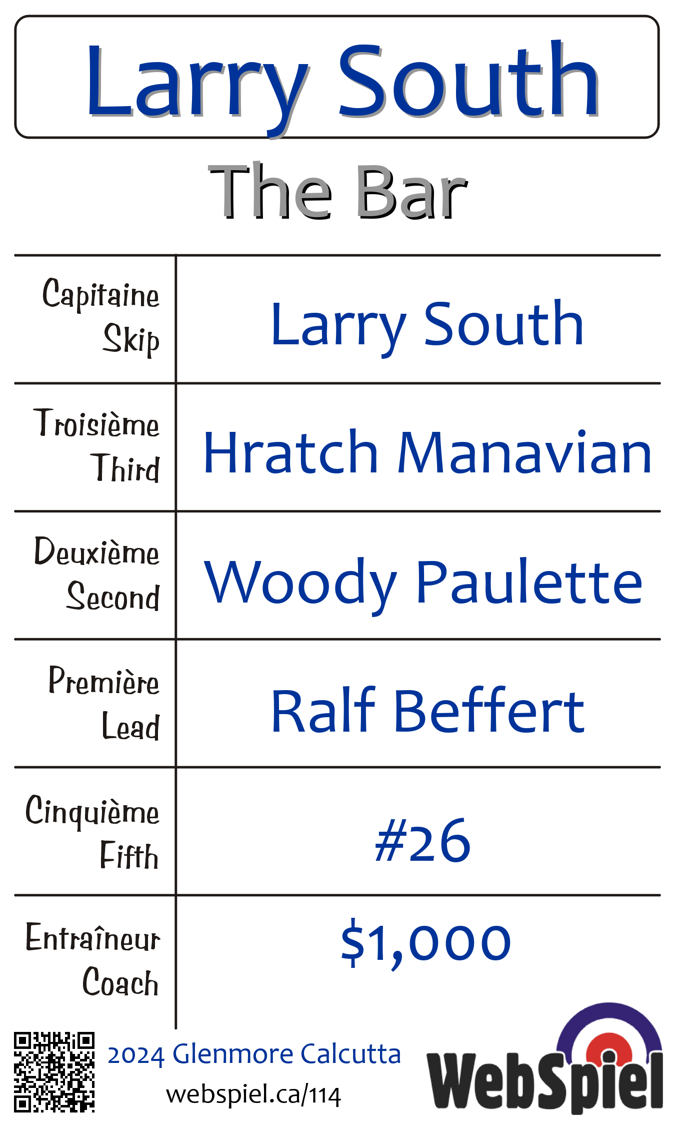 Mardi le 6 février 2024, à 19h00 EST Glenmore Curling Club, Glace 212 · B, Gagnant › A23, Perdant › B02 | |||||||||
