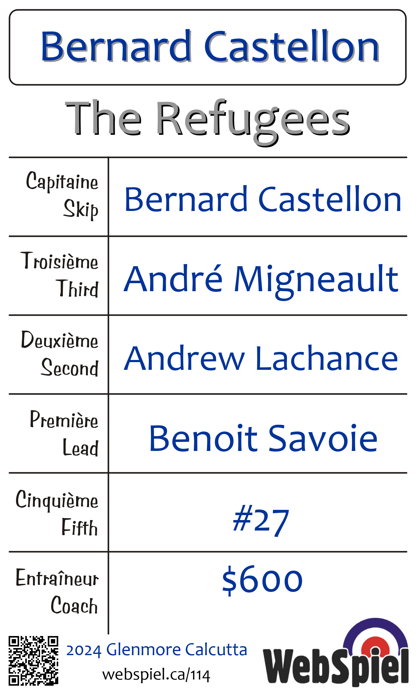 | Club | The Refugees Glenmore Curling Club 120 rue Glenmore Dollard-des-Ormeaux, QC H9B 2X9 CANADA T: 514-684-6350 F: 514-684-6352 http://www.glenmorecurling.com 4 glaces |