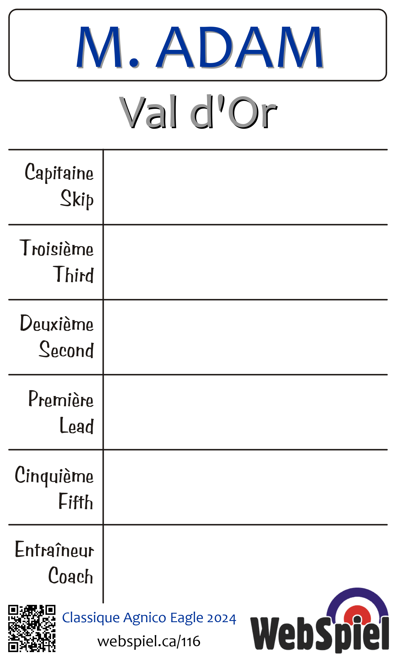Samedi le 16 mars 2024, à 23h00 EDT Club de curling du Belvédère, Glace 4 · D, Gagnant › D07, Perdant › Éliminé | |||||||||