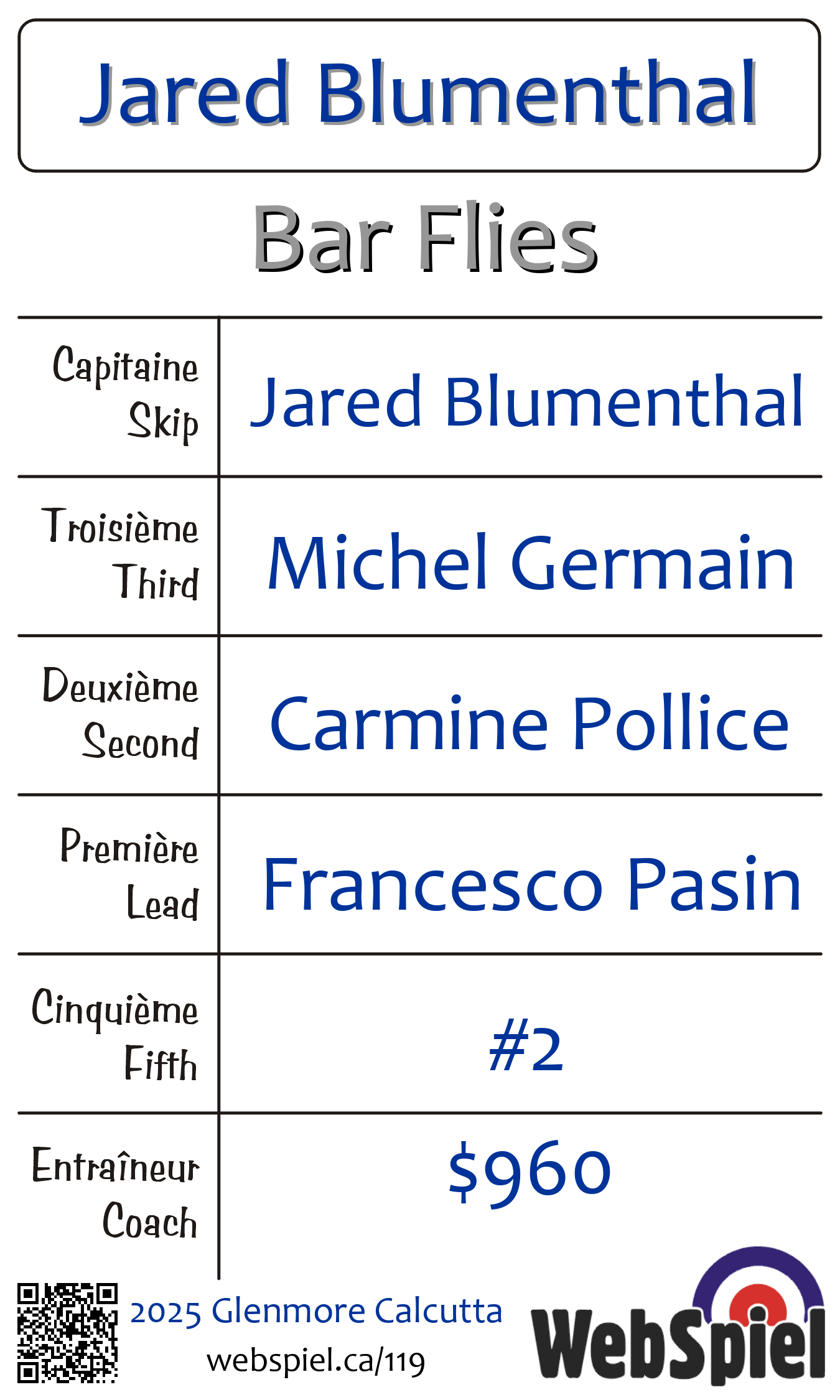 Mardi le 4 février 2025, à 19h00 EST Glenmore Curling Club, Glace 212 · B, Gagnant › A18, Perdant › B05 | |||||||||
