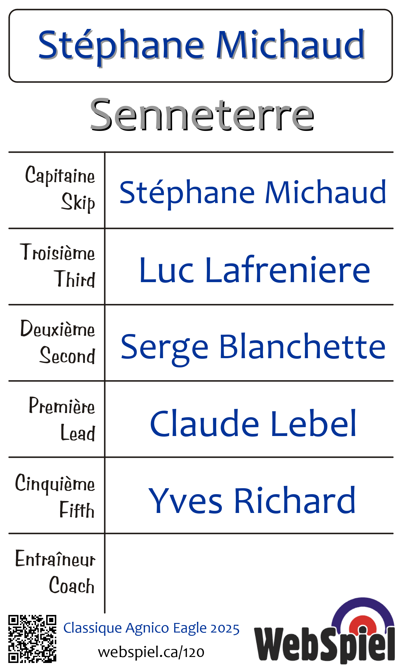 Samedi le 8 février 2025, à 22h30 EST Club de curling du Belvédère, Glace 1 · A, Gagnant › D05, Perdant › Éliminé | |||||||||