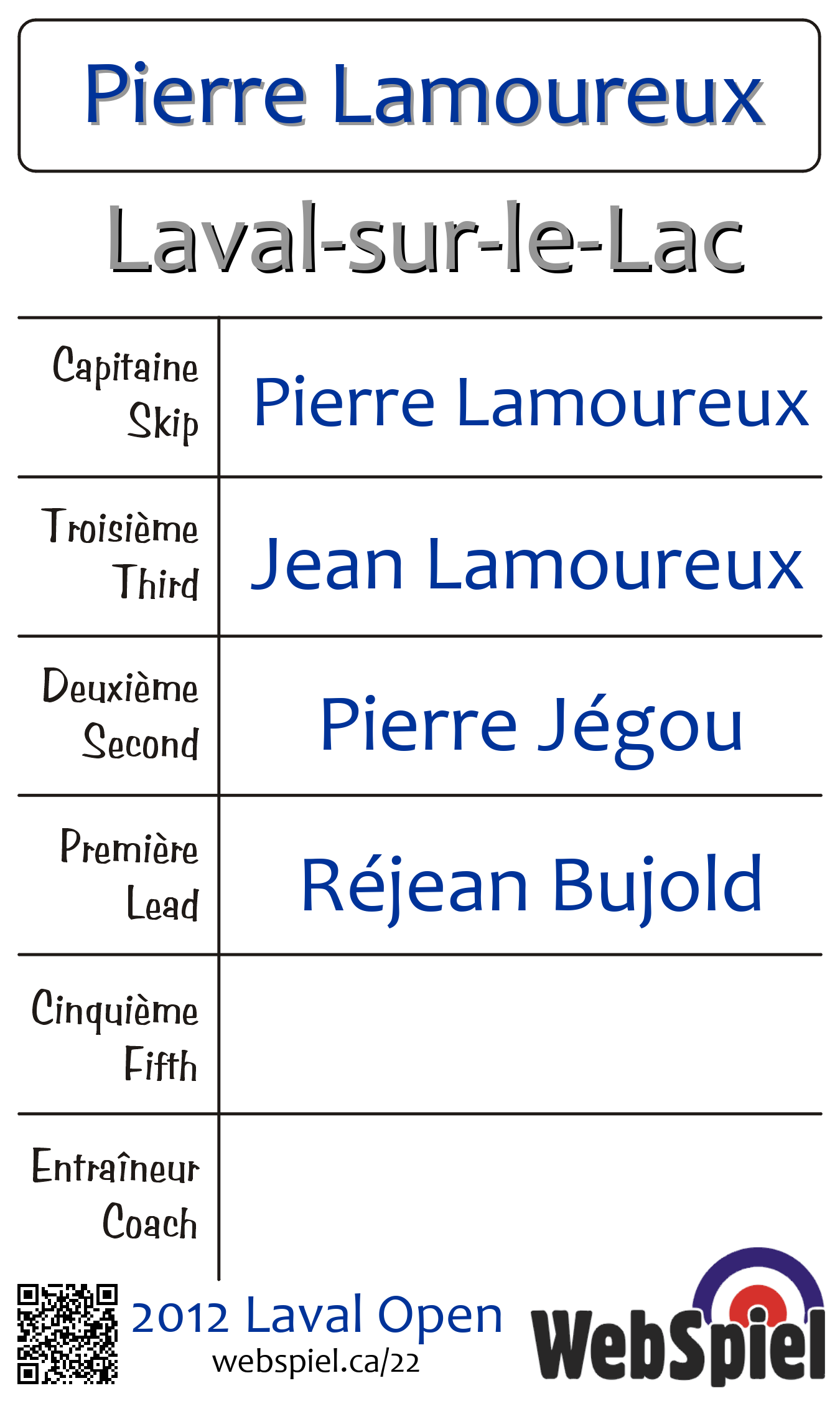 | Club | Laval-sur-le-Lac Club de curling Laval-sur-le-Lac 10 rue les Pins Laval-sur-le-Lac, QC H7R 1C7 CANADA T: 450-627-4791 F: 450-627-7511 http://www.curlinglaval.ca 3 glaces |