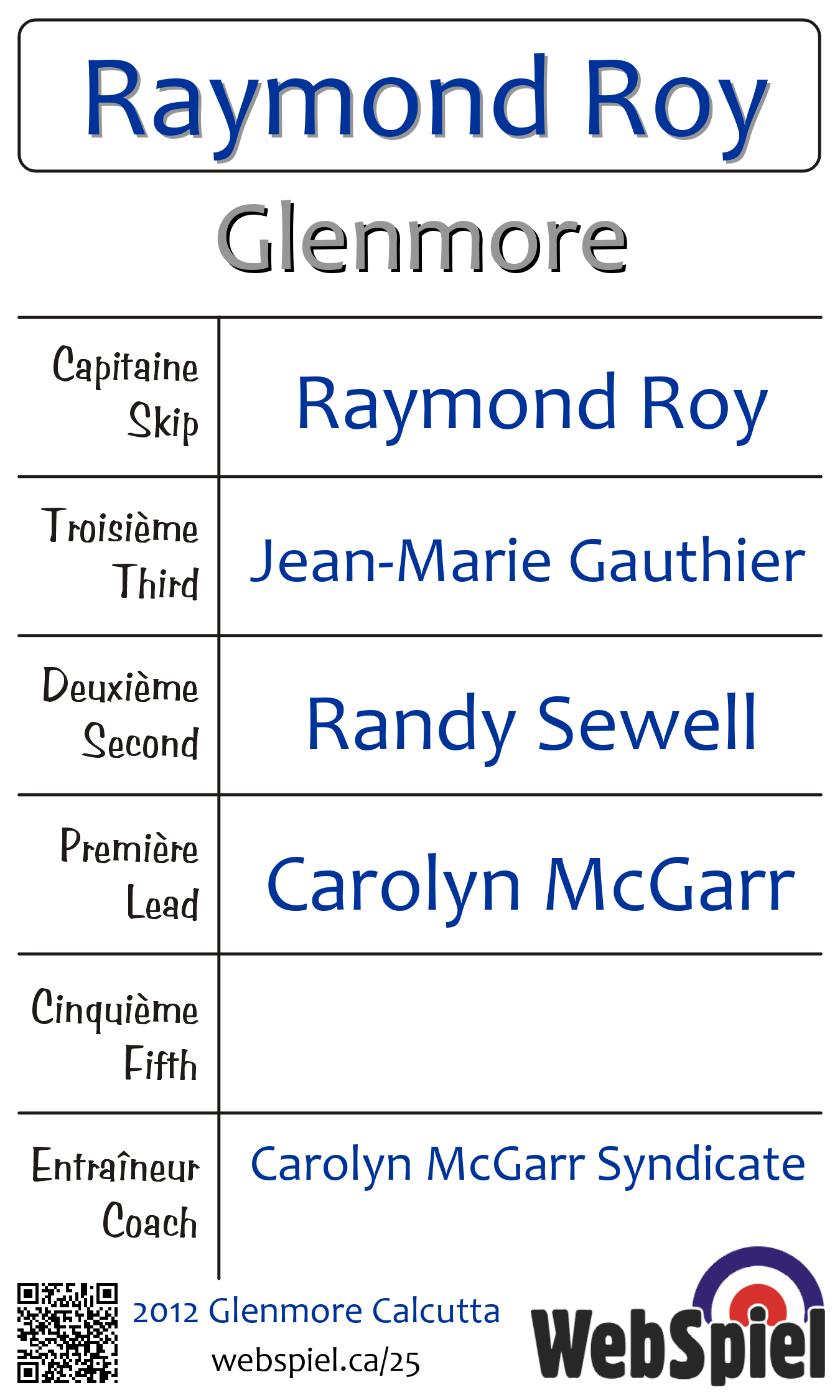 Mardi le 7 février 2012, à 19h00 EST Glenmore Curling Club, Glace 211, Gagnant › A09, Perdant › B01 | |||||||||