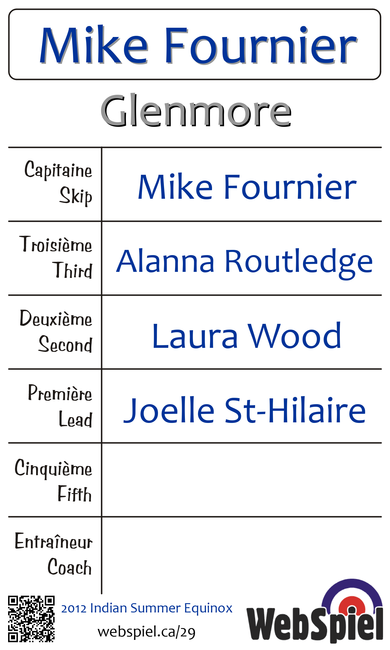 Jeudi le 11 octobre 2012, à 21h00 EDT Glenmore Curling Club, Glace 214, Gagnant › A19, Perdant › C02 | |||||||||
