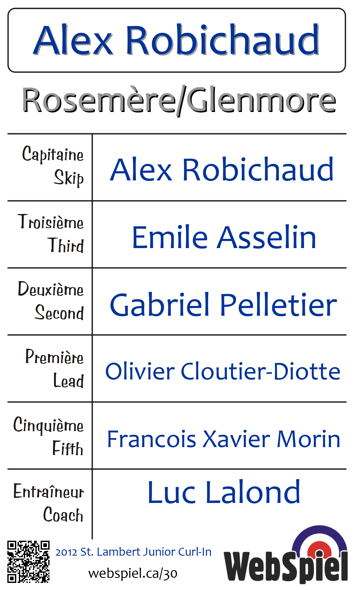Samedi le 13 octobre 2012, à 19h30 EDT Club de curling St-Lambert, Glace 153 | |||||||||