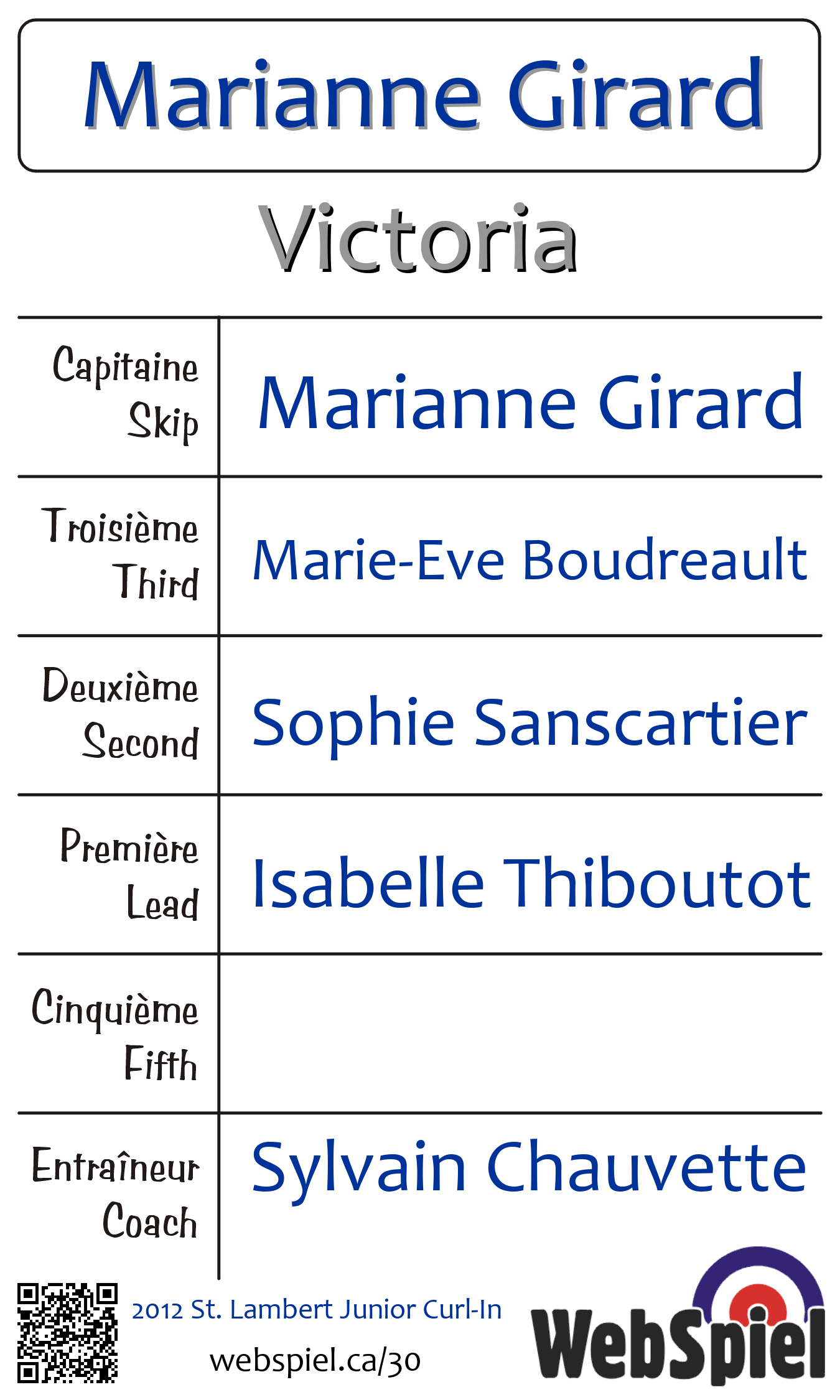 Vendredi le 12 octobre 2012, à 21h00 EDT Club de curling St-Lambert, Glace 153 | |||||||||