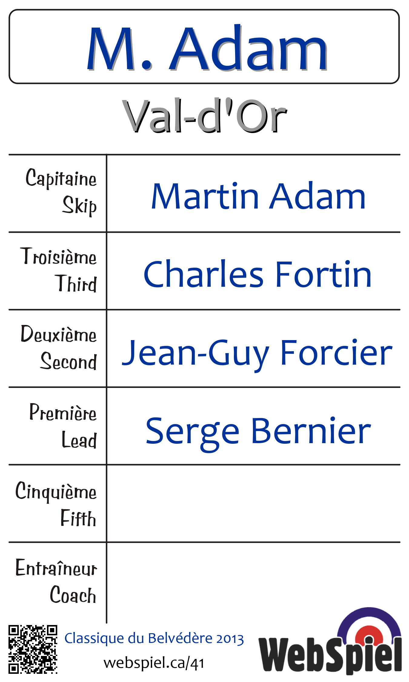 Dimanche le 10 février 2013, à 15h30 EST Club de curling du Belvédère, Glace 2 · B, Gagnant › D10, Perdant › Éliminé | |||||||||