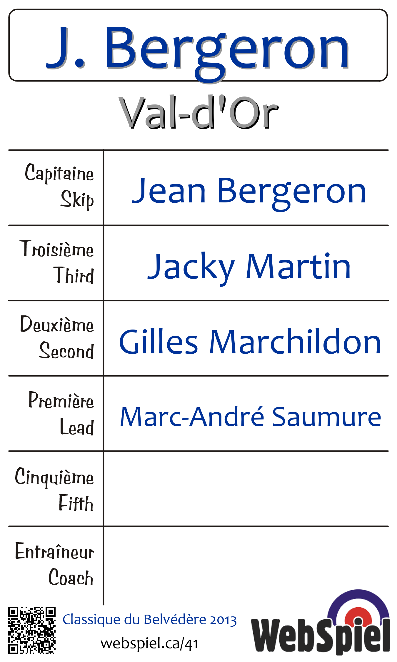 Mardi le 5 février 2013, à 19h00 EST Club de curling du Belvédère, Glace 4 · D, Gagnant › A28, Perdant › C11 | |||||||||