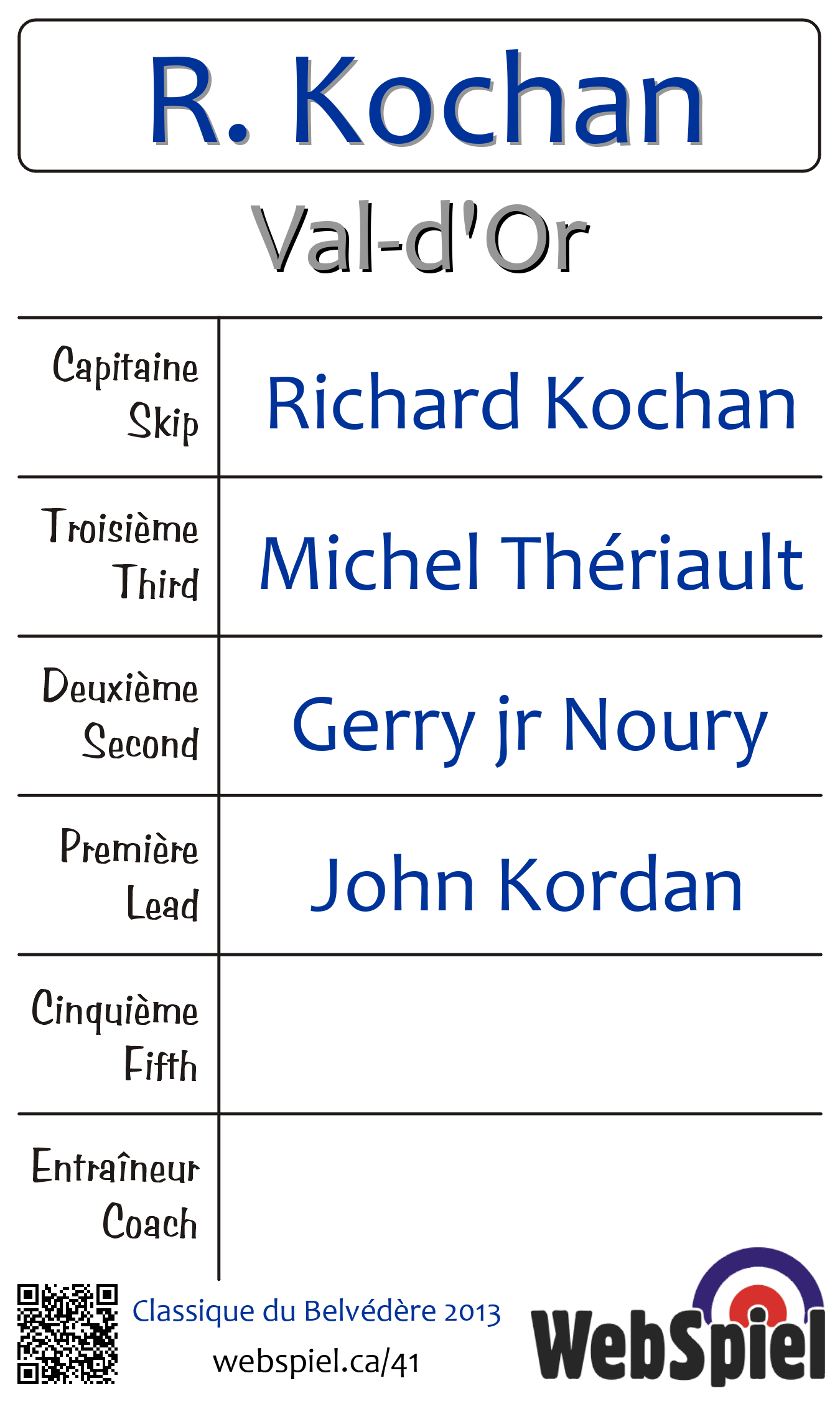 Mardi le 5 février 2013, à 21h00 EST Club de curling du Belvédère, Glace 3 · C, Gagnant › A28, Perdant › C01 | |||||||||