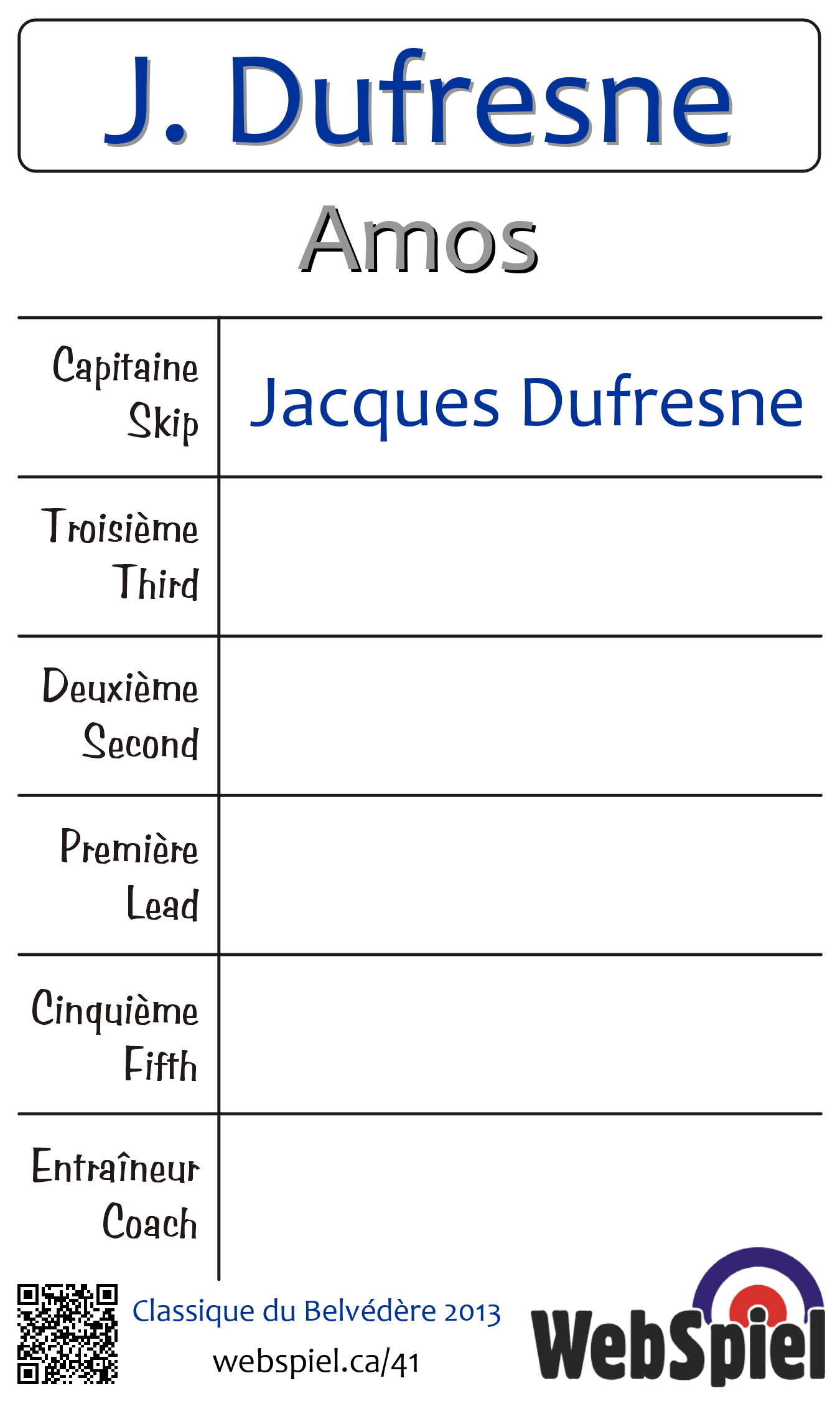 | Club | Amos Club de curling d'Amos 182 10e Avenue Est Amos, QC J9T 1H9 CANADA T: 819-732-6272 F: 819-732-1617 http://www.clubcurlingamos.com |